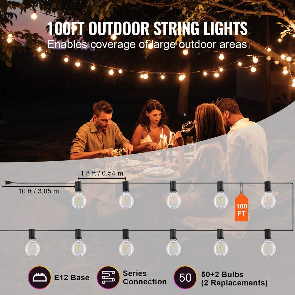 Guirnalda de Luces LED para Exteriores de 30 Metros, Luces de Patio Atenuables con 50 Bombillas G40 Irrompibles, Base de Enchufe E12, 2700K, Resistentes al Agua