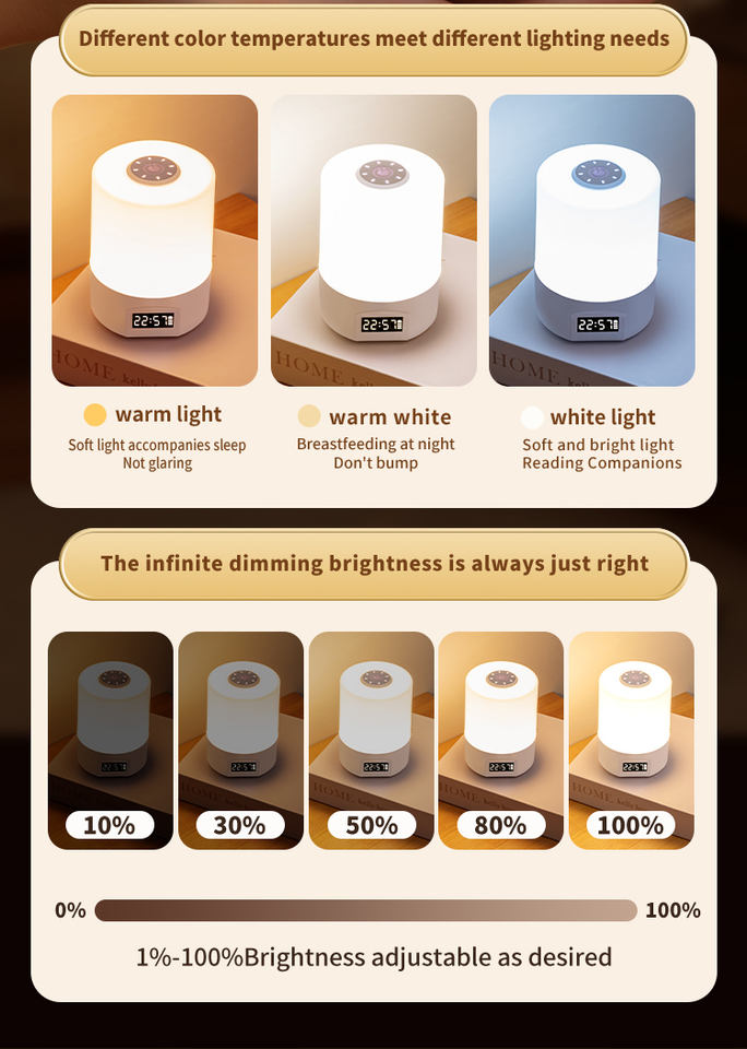 Lámpara de noche LED con control remoto, reloj, indicador de nivel de batería, temperatura de color tricolor, recargable por USB 1200mA, lámpara de mesita