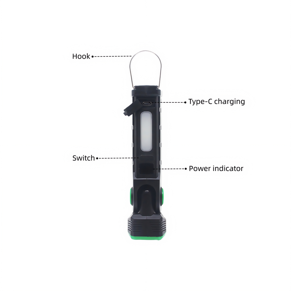Linterna LED de trabajo para mecánicos, campistas y manitas, con gancho plegable, luz COB lateral, cola magnética y carga tipo C
