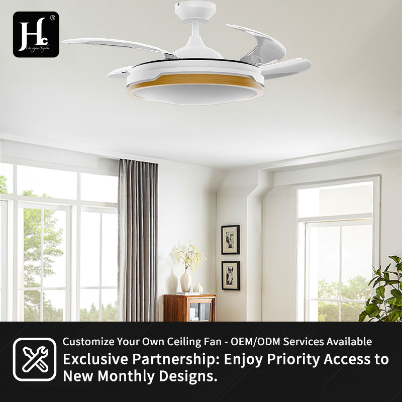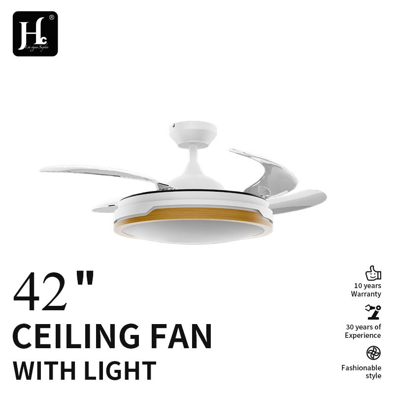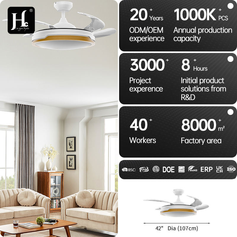 Ventilador de techo LED, motor DC blanco, aspas de diseño, ventilador de techo LED retráctil de 42 pulgadas que ahorra espacio