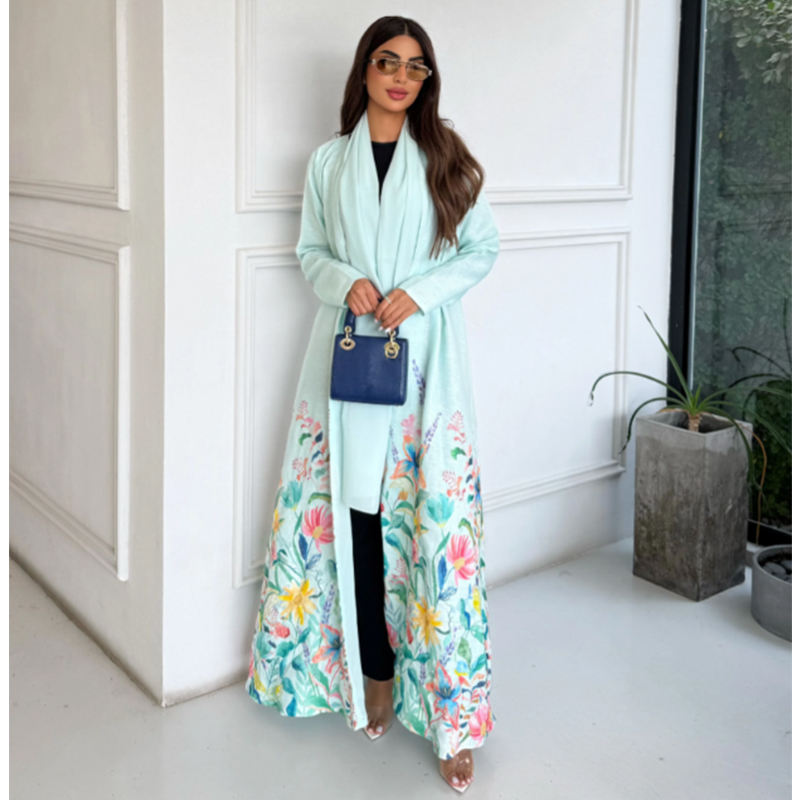 Abaya de Lino LEDUO Azul con Bordado Floral a Mano, Larga hasta el Suelo, Mangas Largas, Pañuelo a Juego del Mismo Color