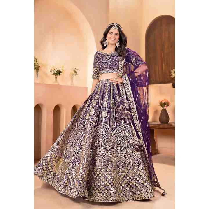 LEHENGA con detalles de tela, bordado de red, diseño de lentejuelas, satén interior con cancan y lona