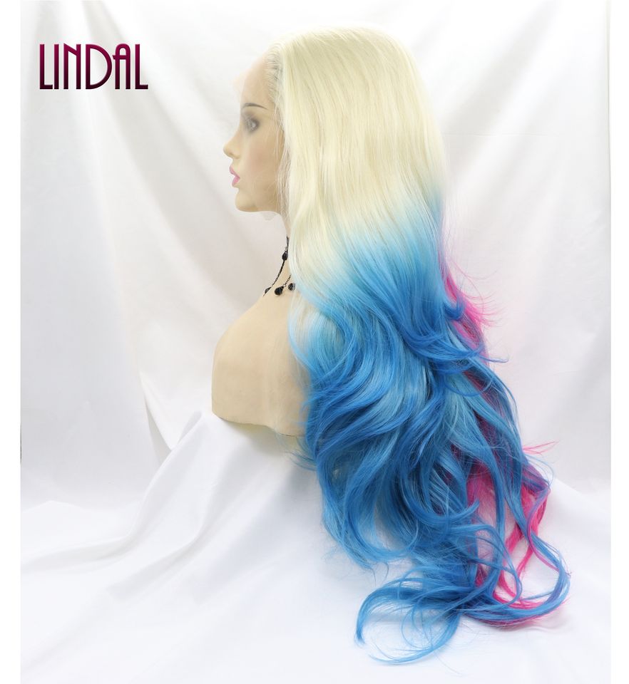 Peluca Sintética LINDAL de Fibra de Alta Temperatura, Colores Mezclados de Rosa a Azul, Estilo Harley Quinn, Ondas Naturales, Todos los Colores, con Frente de Encaje