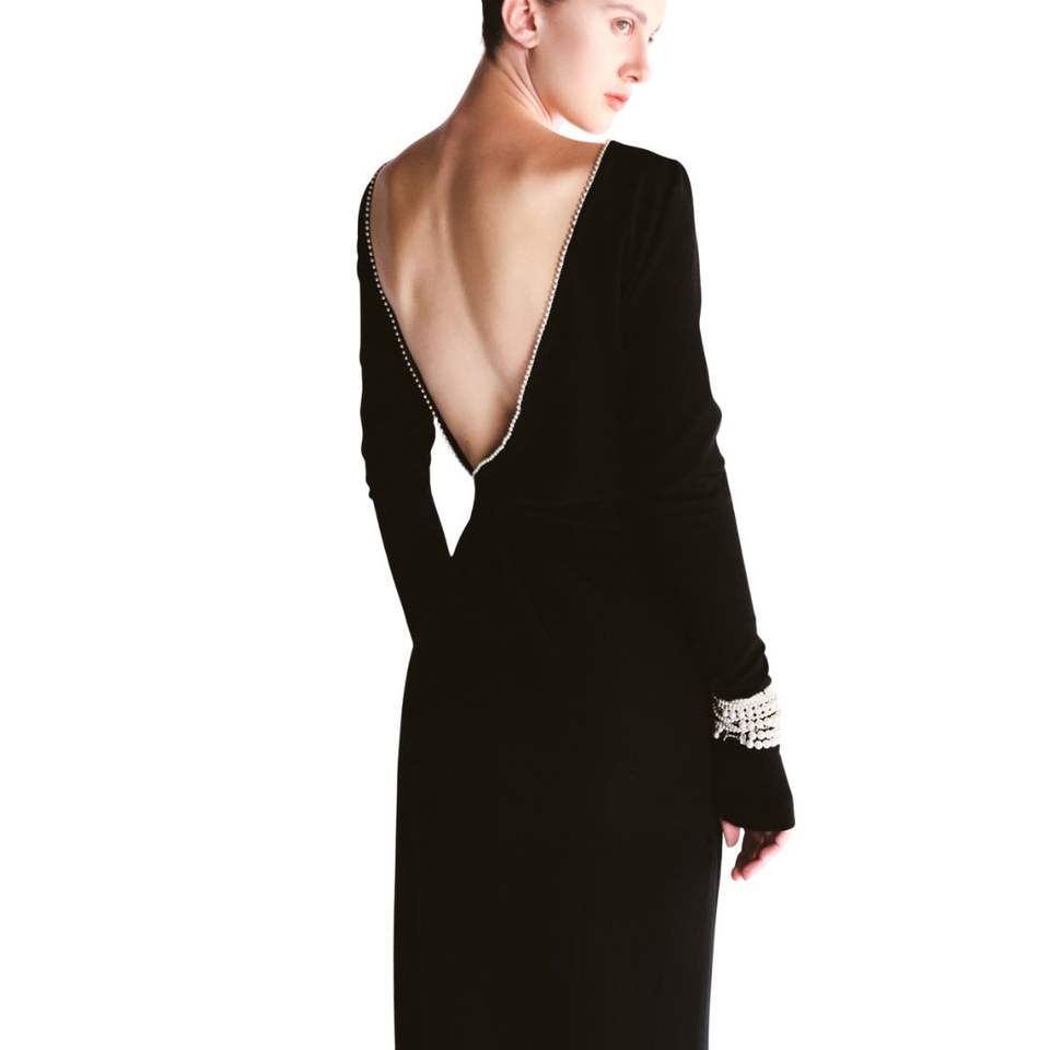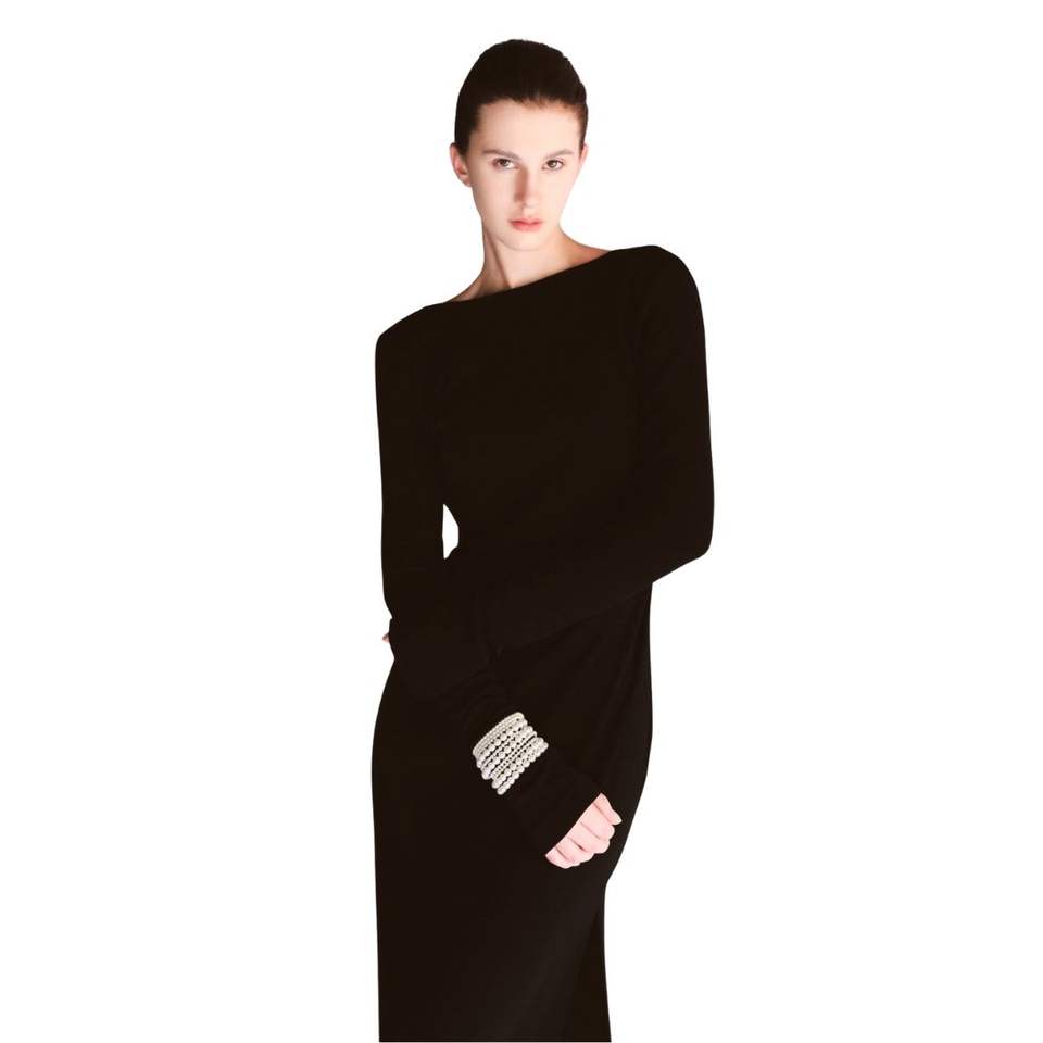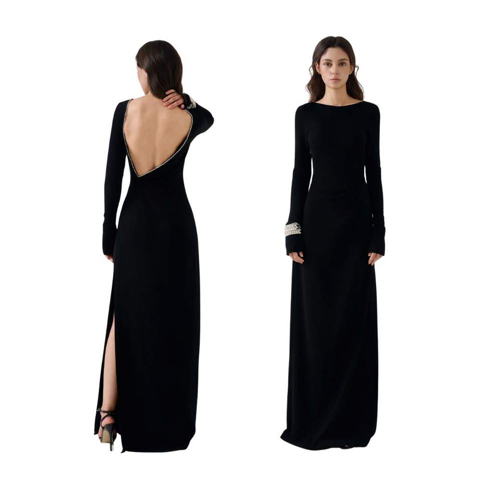 LIRNA EMB negro de primera calidad para mujer elegante DRAPEADO MAXI VESTIDO LARGO espalda abierta manga larga etiquetas personalizadas Método de tejido