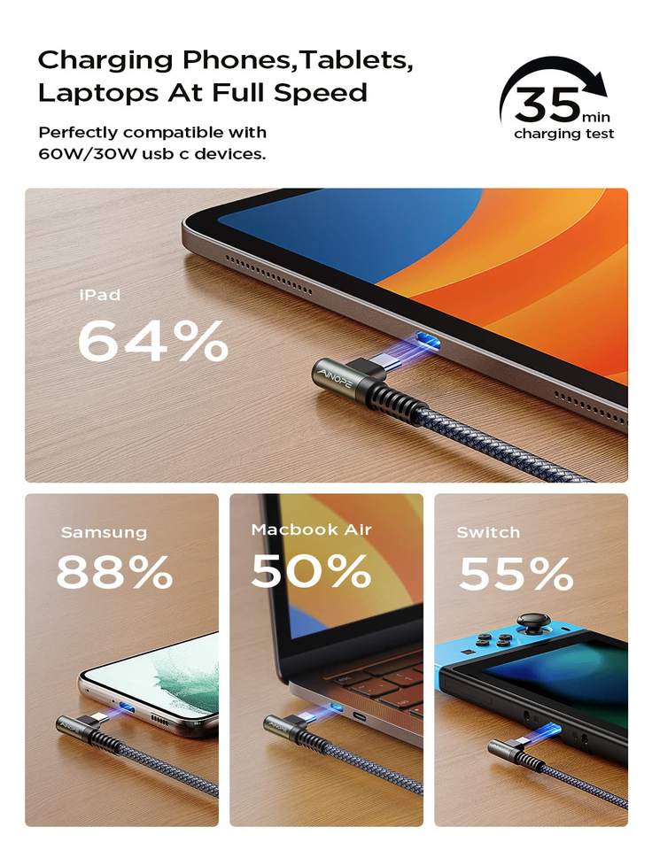 Nombre del producto:Cable USB C a USB C en ángulo recto LISEN de 60W, 1m, de carga rápida