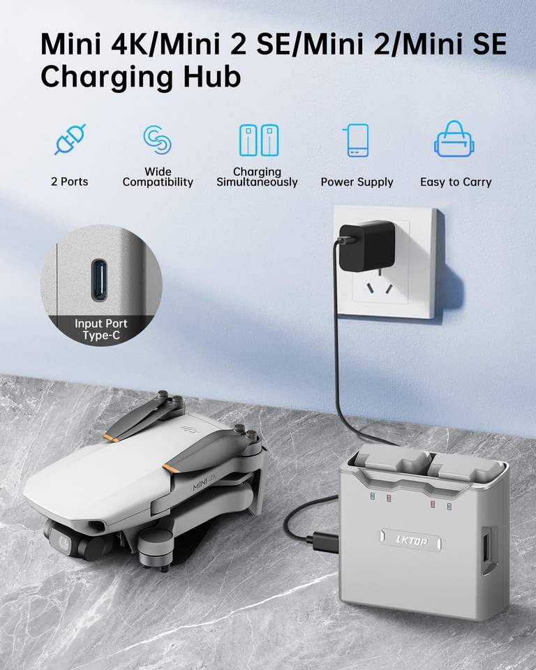 LKTOP para la serie Mini 4K/Mini2, centro de carga rápida de batería dual con adaptador de corriente USB-C para accesorios de drones