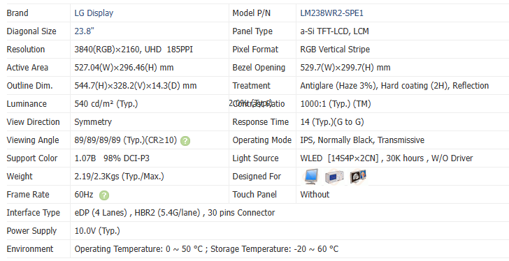 Pantalla LCD Industrial LM238WR2-SPE1 de 23.8 Pulgadas, UHD 3840*2160, 540nits, Módulos LCD, Monitor de Escritorio, Pantalla TFT Médica
