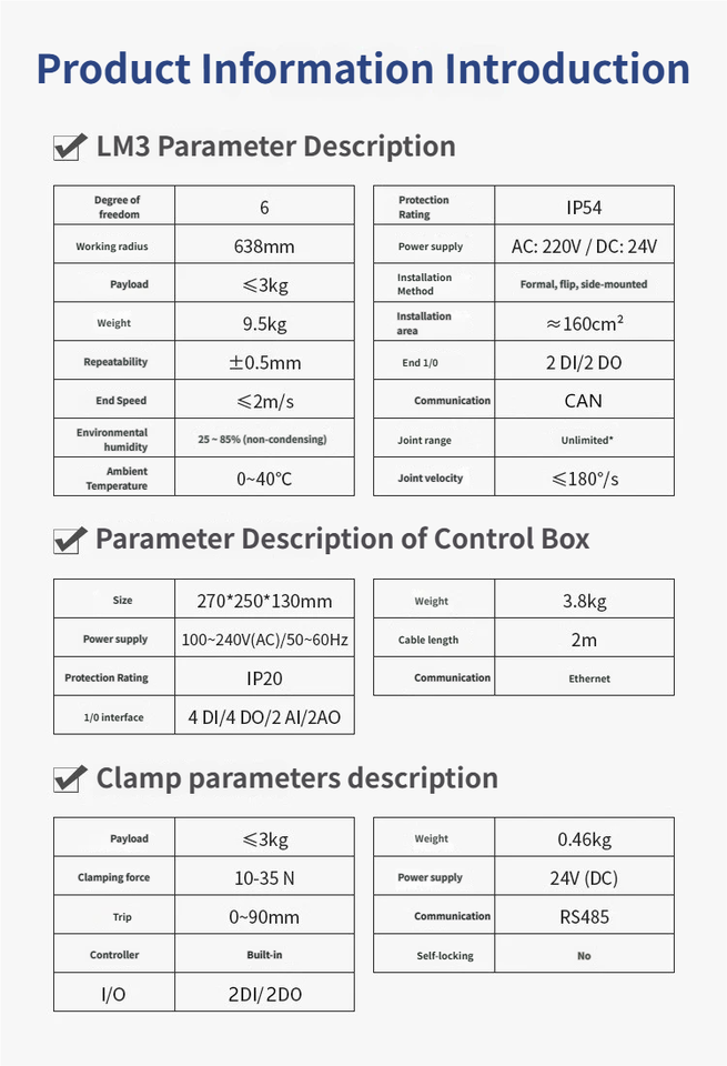 Brazo Robótico Colaborativo LM3 de 6 Ejes, Carga Útil de 3 kg, Alcance de 638 mm, Cobot Ligero para Ensamblaje, Manipulación, Educación e I+D
