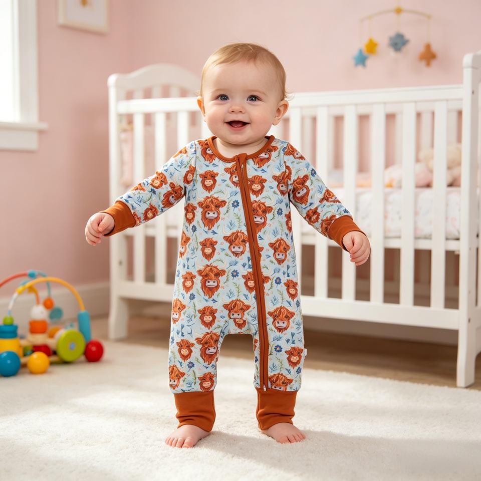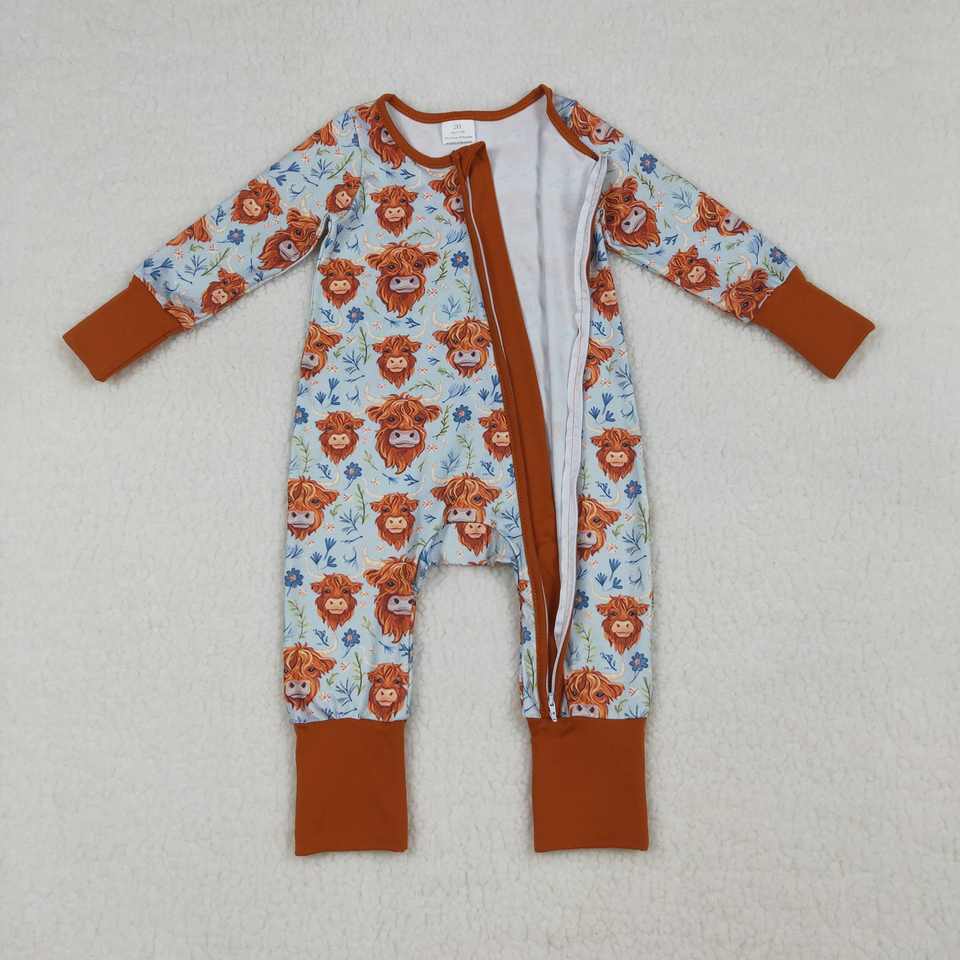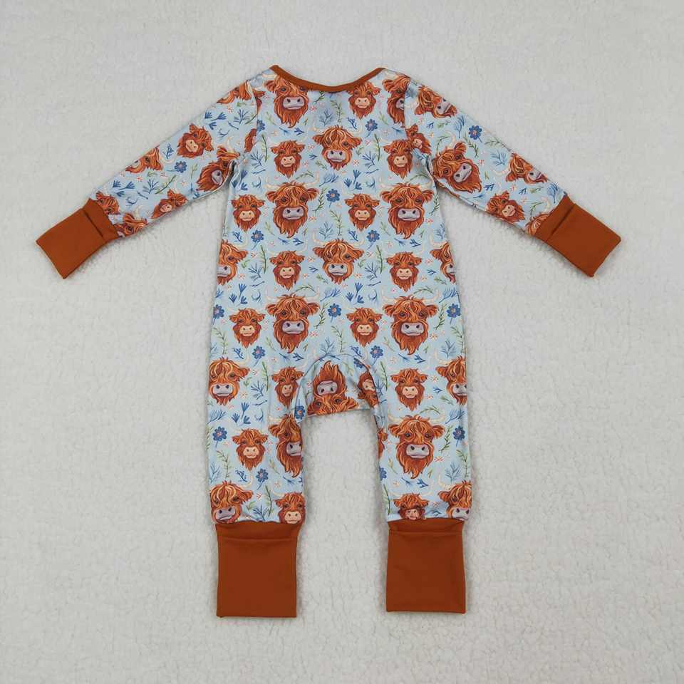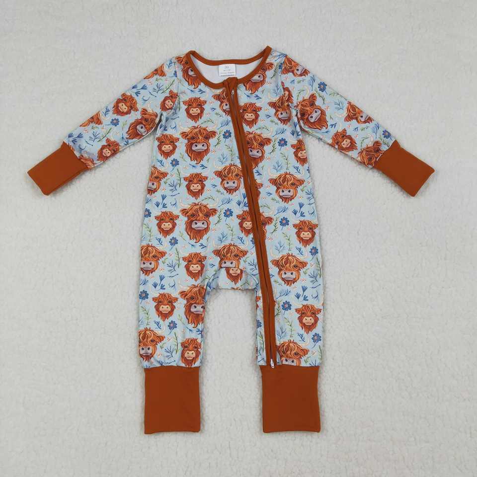 LR1787 RTS Mono de Manga Larga para Bebé, Estilo Estampado de Vaca de las Tierras Altas Occidentales, Venta al por Mayor, Mono Bonito para Niña