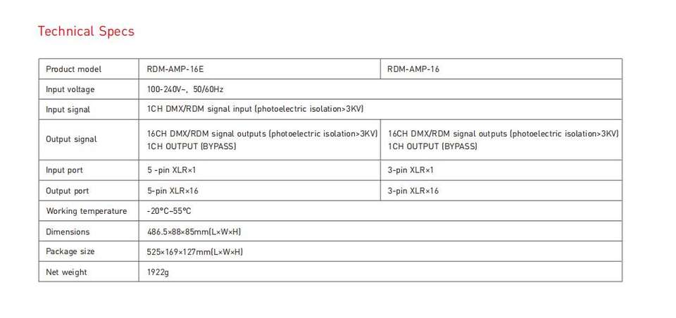 Señal de salida:16 salidas de señal DMX/RDM; 1 salida de canal (BYPASS)