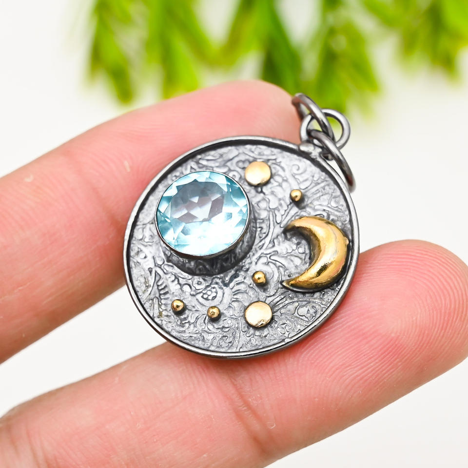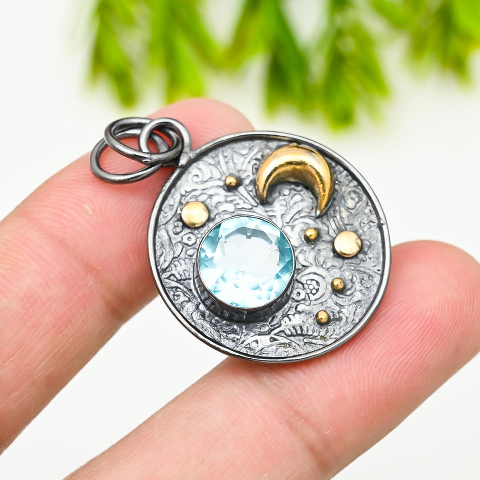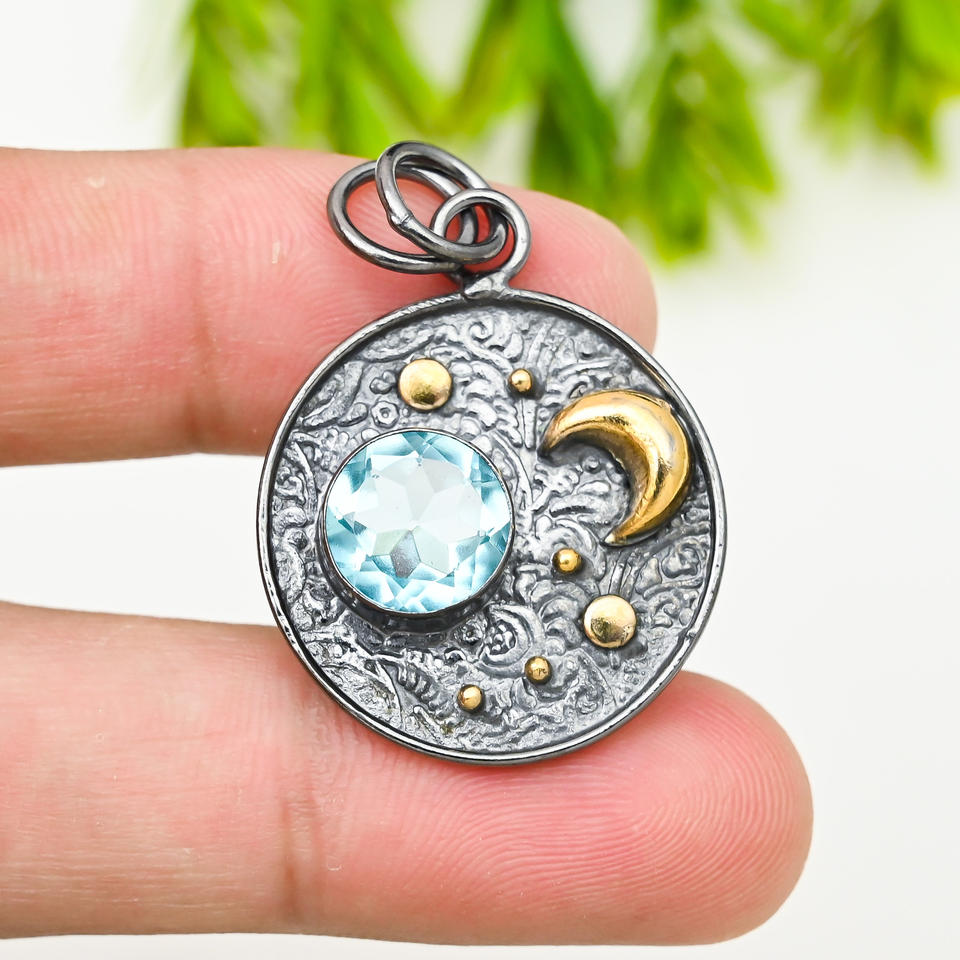 Colgante de Topacio Azul Creado en Laboratorio, Unisex, Piedra Preciosa de 10 mm, Metal Plateado, 1.80 Pulgadas, Joyería de Moda de Lujo para Bodas y Fiestas, Venta al por Mayor