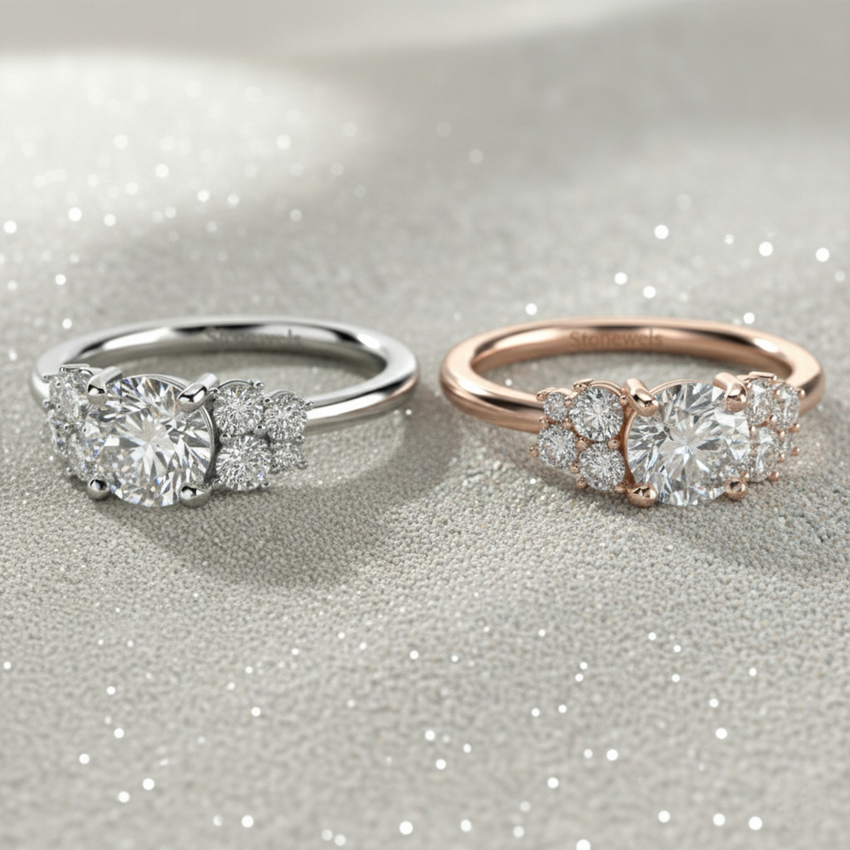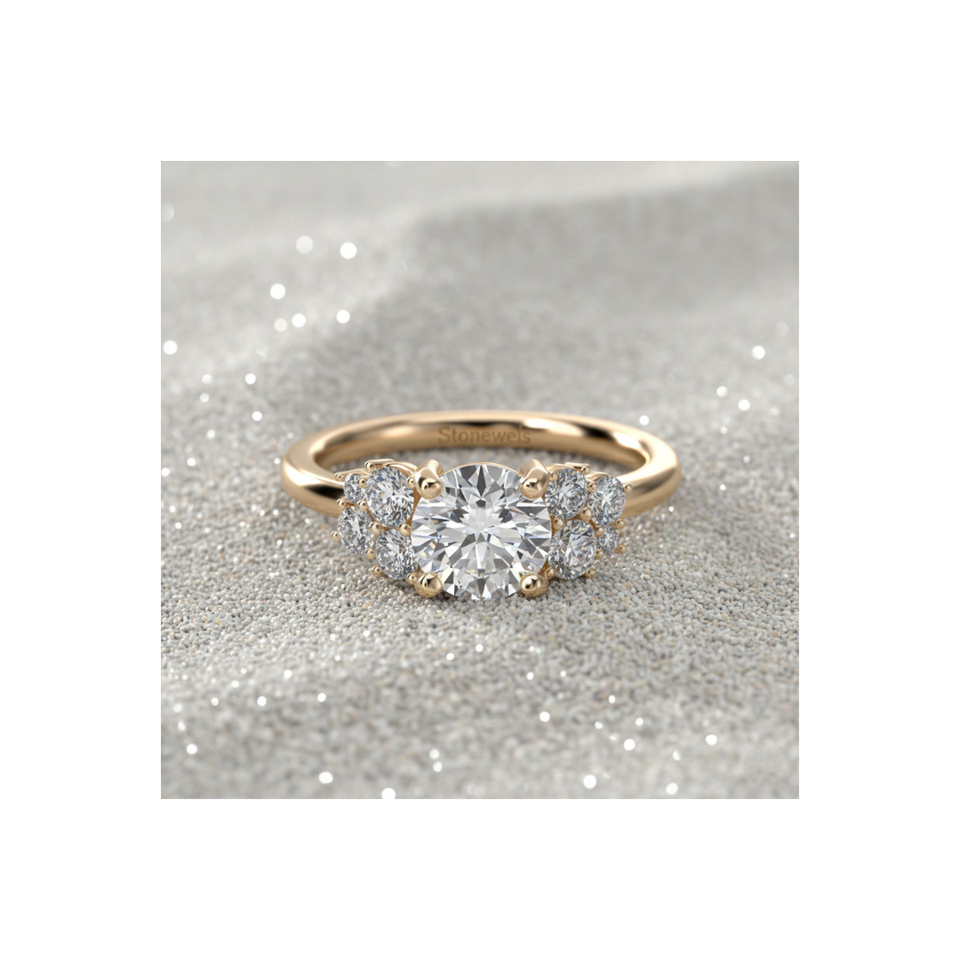 Anillo de Compromiso con Diamante Creado en Laboratorio, Corte Redondo, Piedra Central con Racimo de Piedras Laterales, Fábrica de Joyería OEM ODM