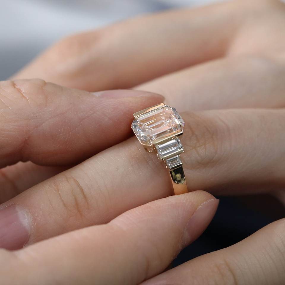 Anillo de Oro Real con Diamantes Creados en Laboratorio, Estilo Art Deco, Corte Esmeralda, Cinco Piedras, Engaste de Media Bisel, Hecho a Mano, Corte Escalonado, Anillo de Declaración