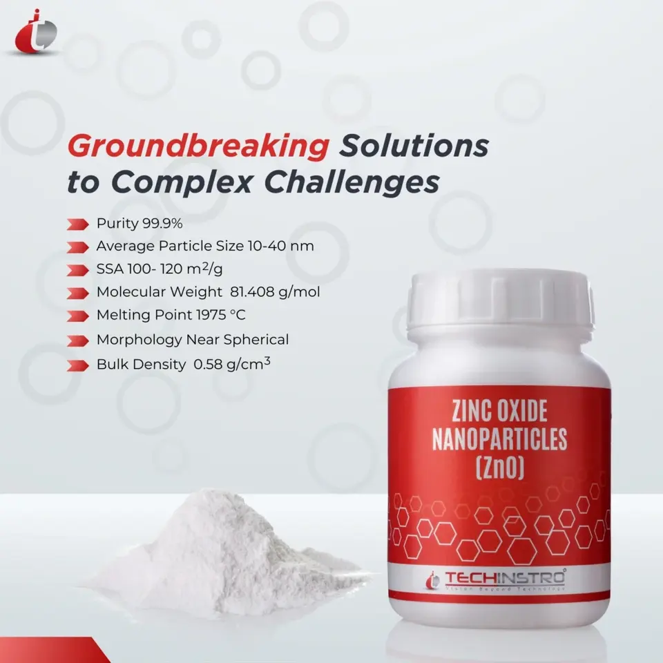 Nanopartículas de Óxido de Zinc de Grado Laboratorio (TECHINSTRO) Capacidad de 1 kg para Uso Industrial Biomédico Personalización ODM/OEM Alta Temperatura de Fusión