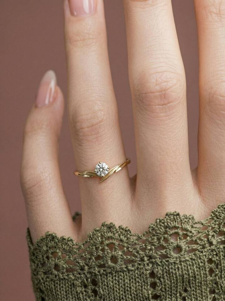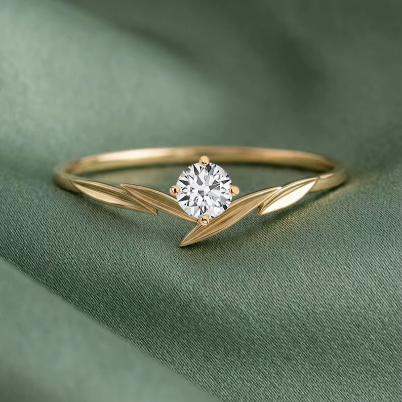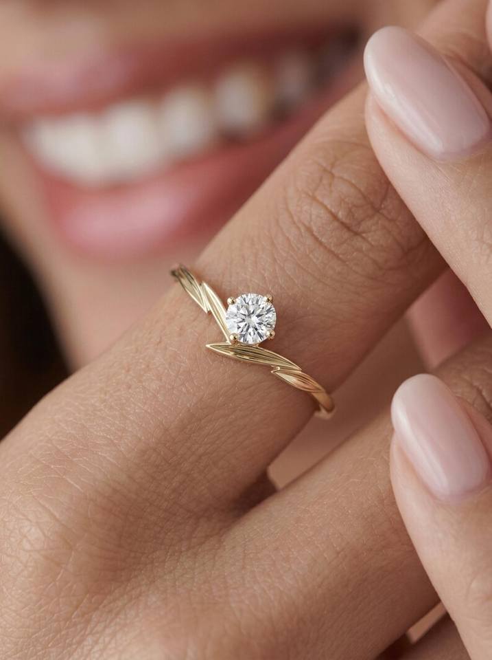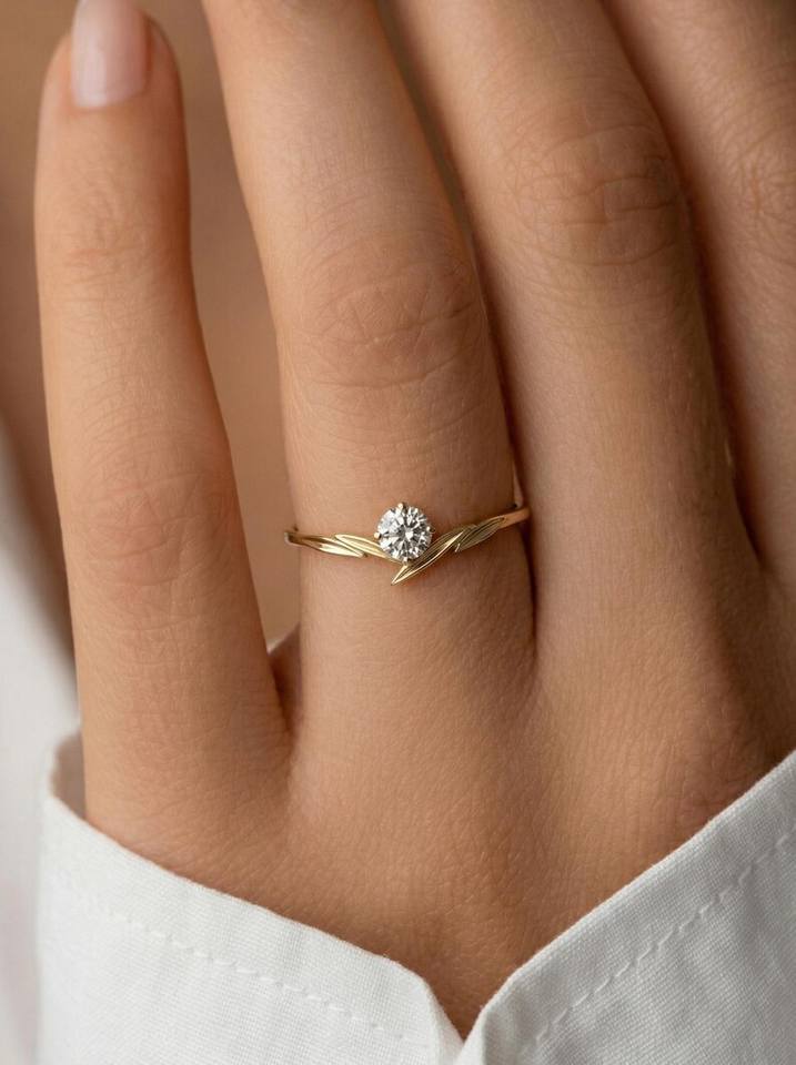 Anillo Delicado con Hoja Natural y Diamante de Corte Redondo