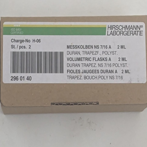 Frasco Volumétrico de Vidrio para Laboratorio, 2 ml, Clase A, Duran 2960140 X 2, Nuevo, Original, Spot Plc