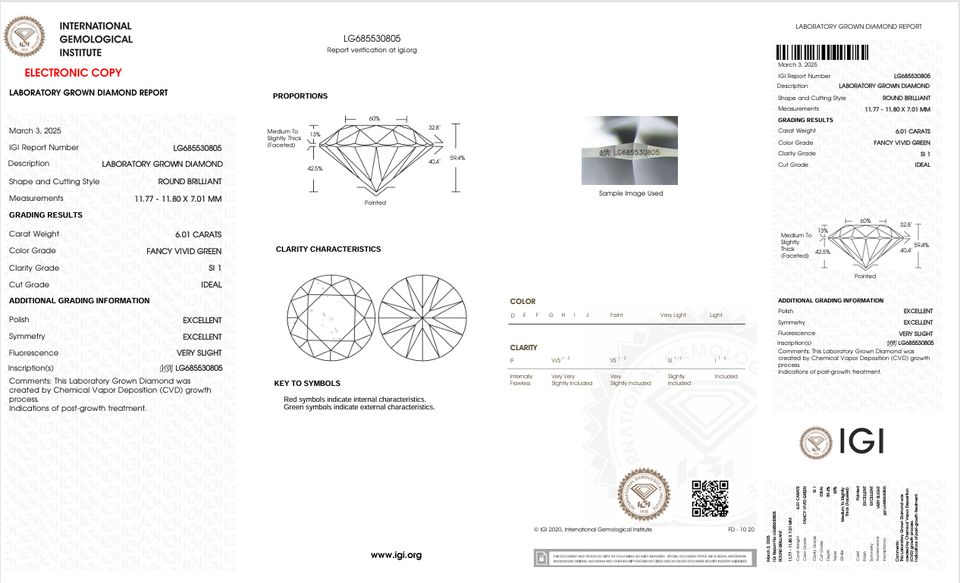 Diamante Suelto Cultivado en Laboratorio, Corte Redondo, 6.01 Quilates, Verde Claro Fantasía, Perforado con Láser, Certificado IGI, para Joyería