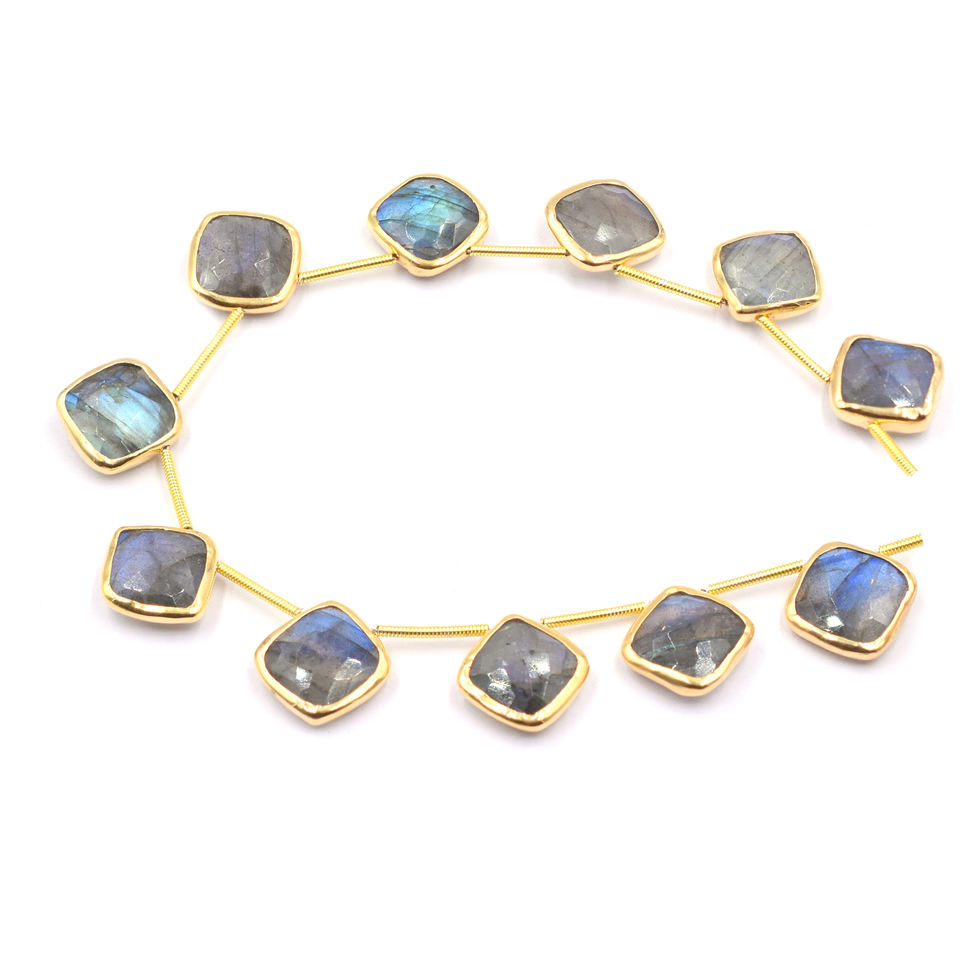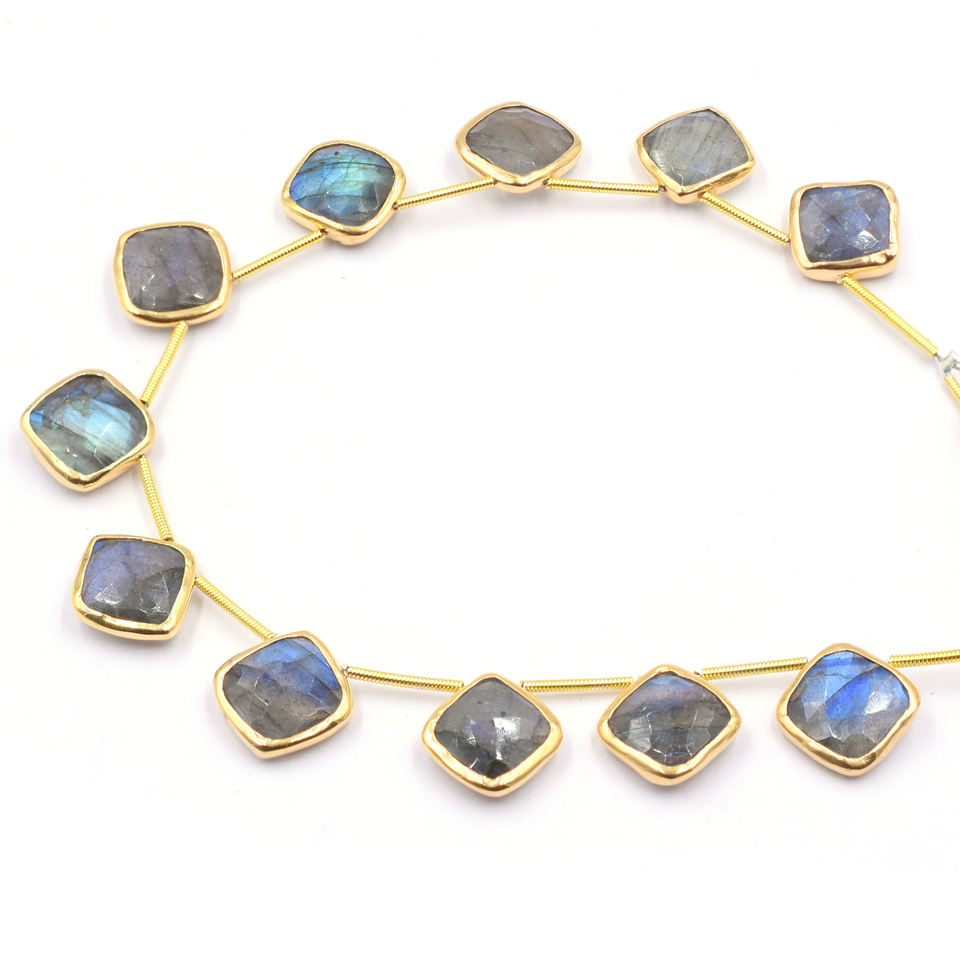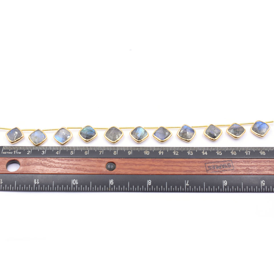 Labradorita de 11-13 mm, Forma Cojín, Bisel de Plata Chapada en Oro de 14K, Azul y Gris, Perforación Superior, Hilo de 11 Cuentas
