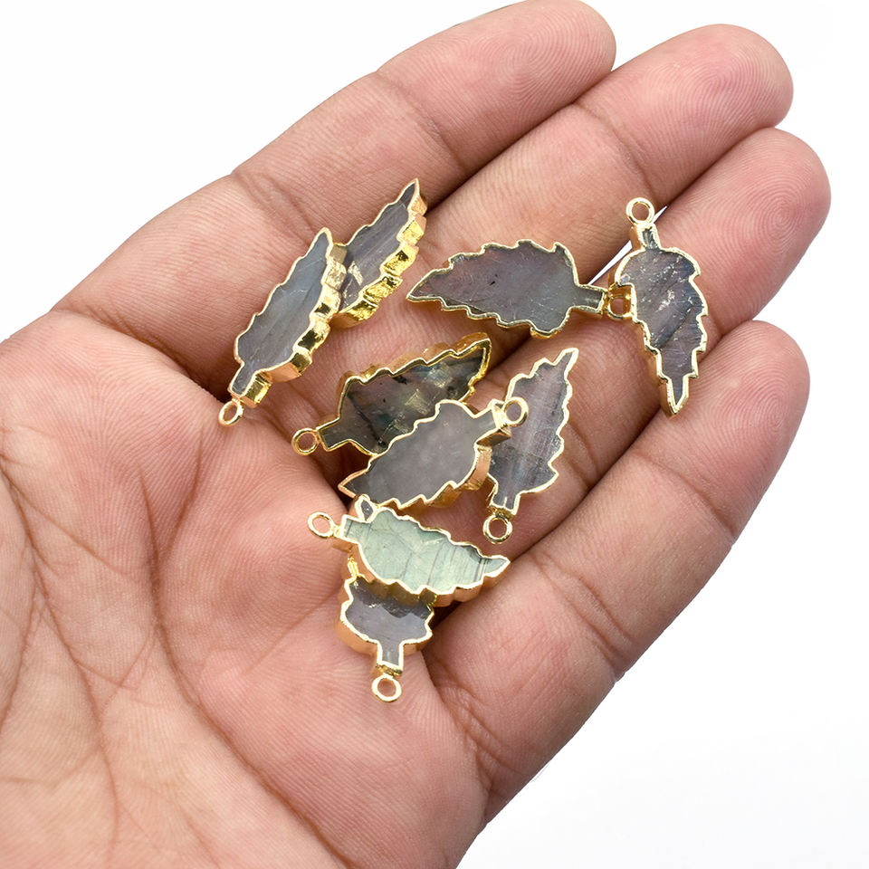 Colgante de Labradorita de 27-29 mm con Base de Latón, Chapado en Oro, Forma de Hoja y Componentes de Joyería de Piedra Natural