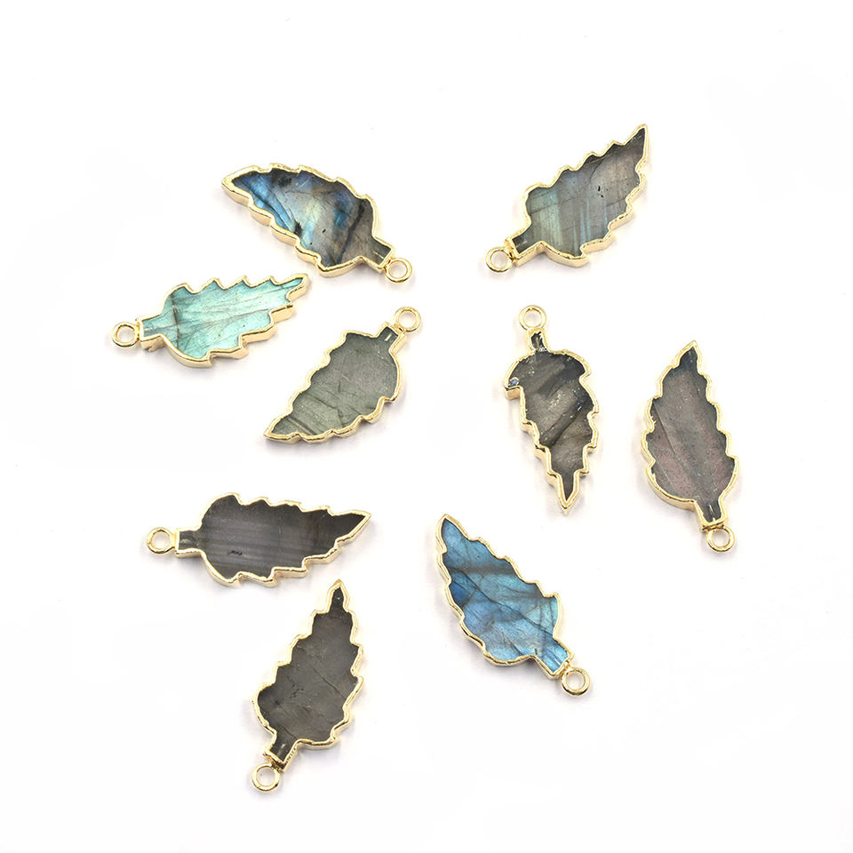 Labradorita de 27 a 29 mm con colgante chapado en oro con forma de hoja y asa.