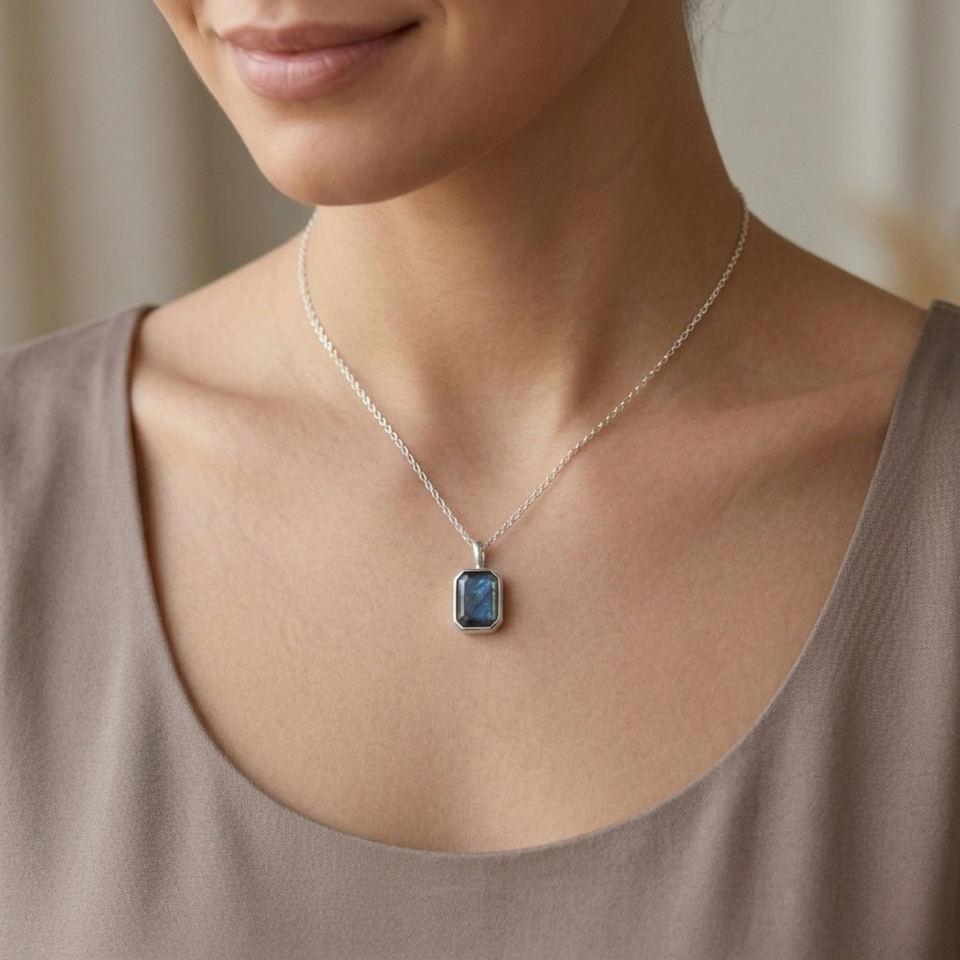 Colgante de labradorita con forma octogonal y engaste de plata de ley, chapado en plata, para el mes de nacimiento de noviembre