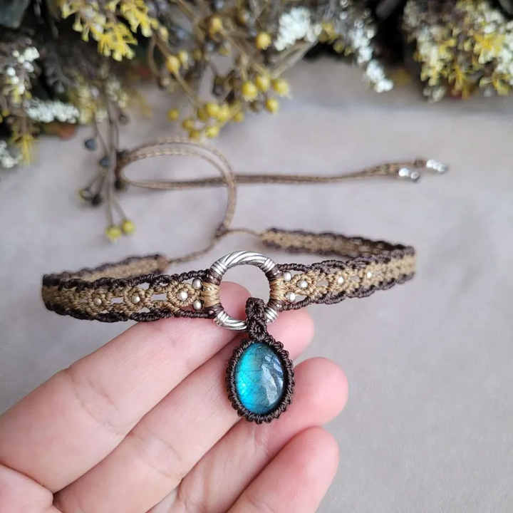 Pulsera de Macramé con Labradorita, Gema Ovalada con Destello Azul, Cordón Marrón, Cuentas de Perlas, Joyería Boho Hecha a Mano