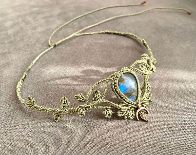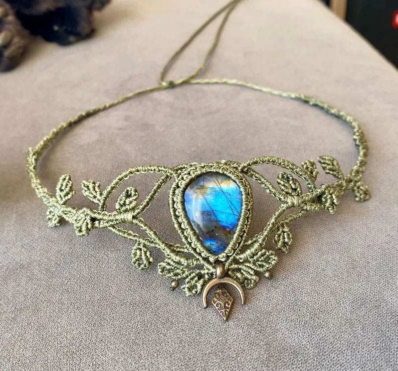 Pulsera de Macramé con Labradorita, Gema en Forma de Lágrima con Destello Azul, Cordón Oliva, Amuleto de Luna, Joyería Boho Hecha a Mano, HARI OM CREATIONS