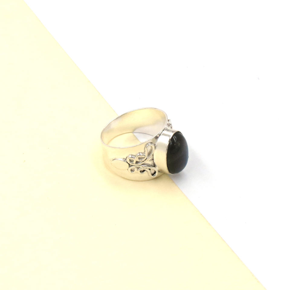 Anillo llamativo de labradorita natural, gema ovalada de 10x14mm, chapado en plata con acabado mate, estilo bohemio, con efecto flash.