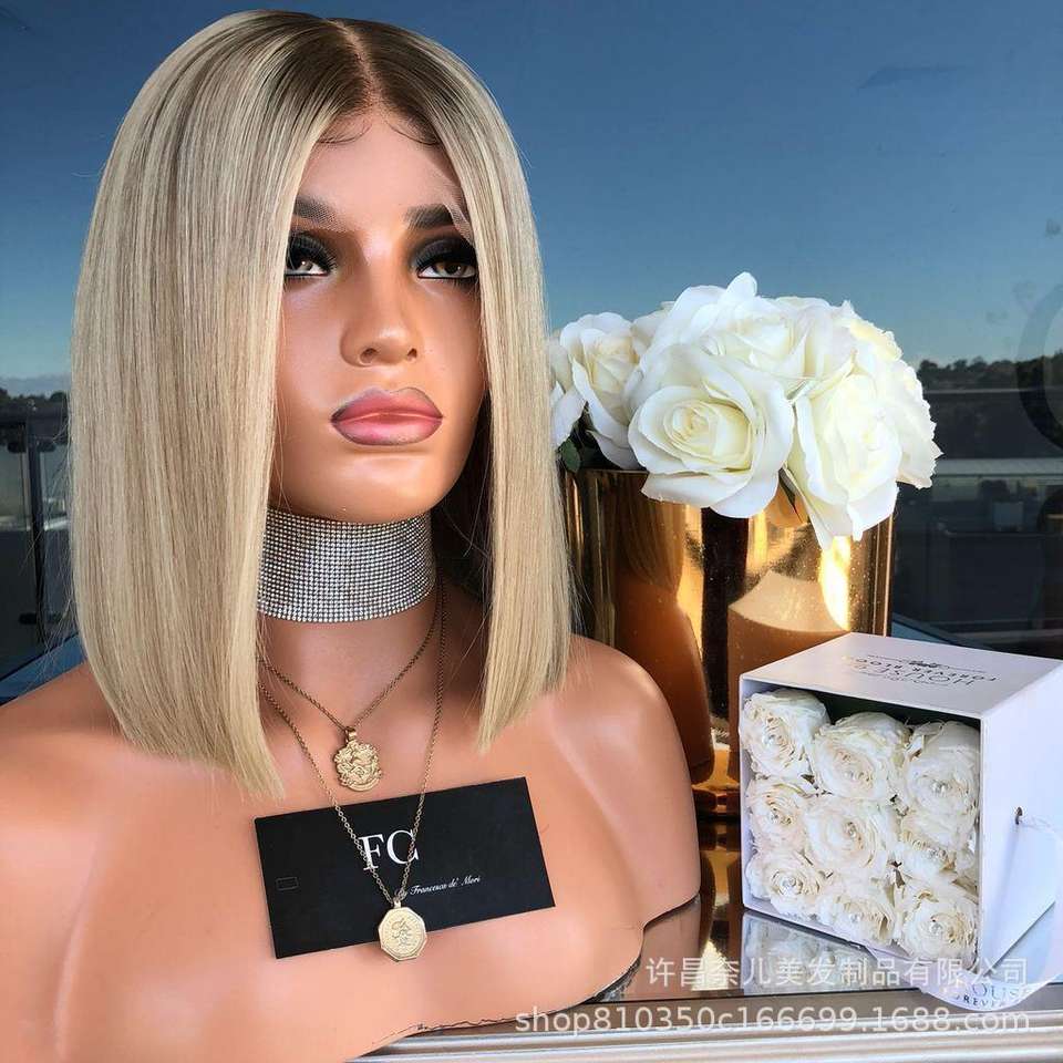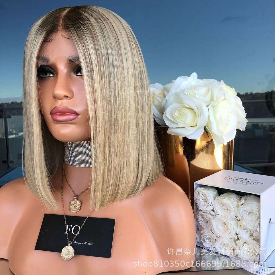 Peluca Bob de oro negro de 12 "con frente de encaje, peluca de pelo recto corto sintético resistente al calor con parte media y cuero cabelludo simulado para mujer