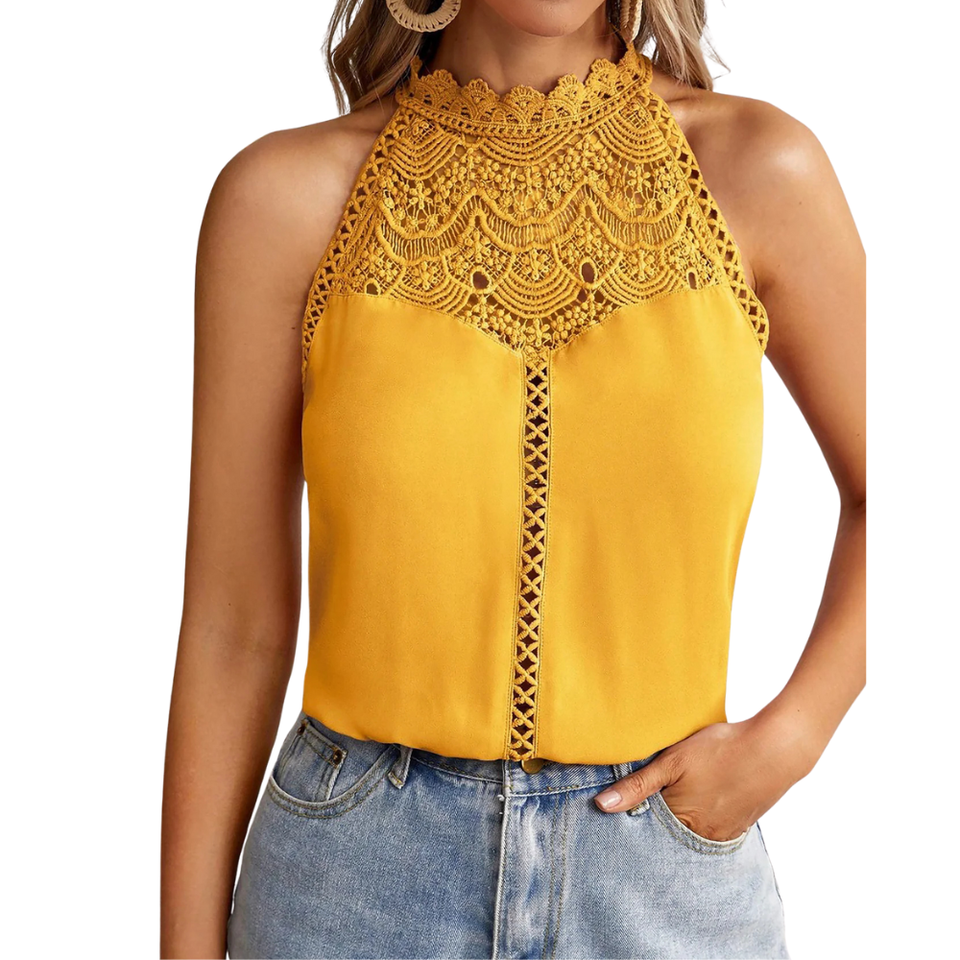 Blusa Halter con Encaje y Patchwork para Mujer, Manga Fruncida, Cuello con Botones, Panel Floral, Chifón, Estilo Casual, Proveedor Mayorista