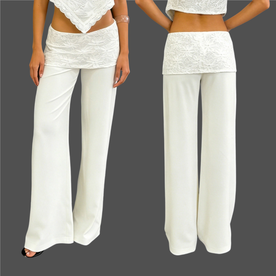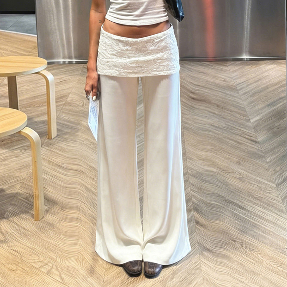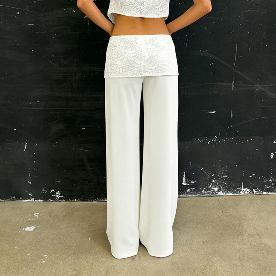 Pantalones Casuales de Pierna Recta con Cintura de Encaje y Parches, Color Sólido, Estilo Básico Versátil para Primavera y Otoño