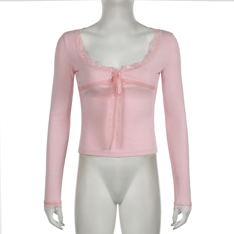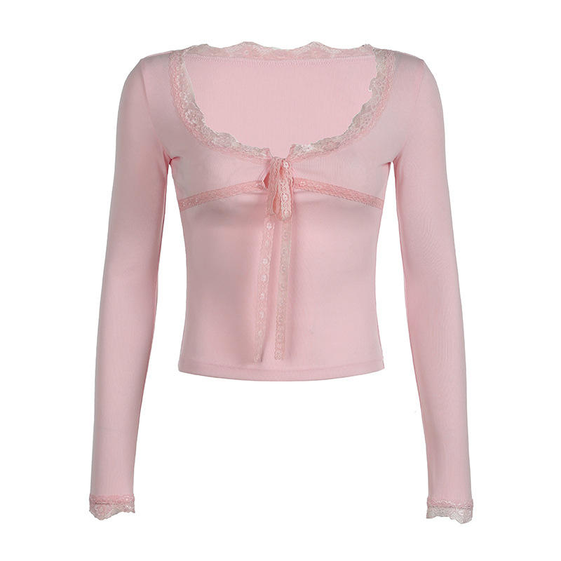 Camiseta de manga larga con lazo de encaje, nueva colección de verano, ajustada, para mujer, con lazo y cuello cuadrado, a la moda.