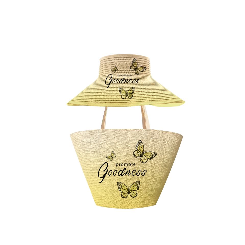 Bolso de Mano de Paja con Diseño de Mariposas y Degradado de Color Rosa con Sombrero para Mujer, para la Playa en Verano