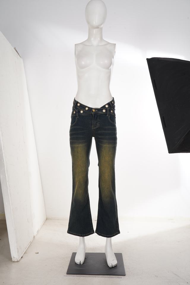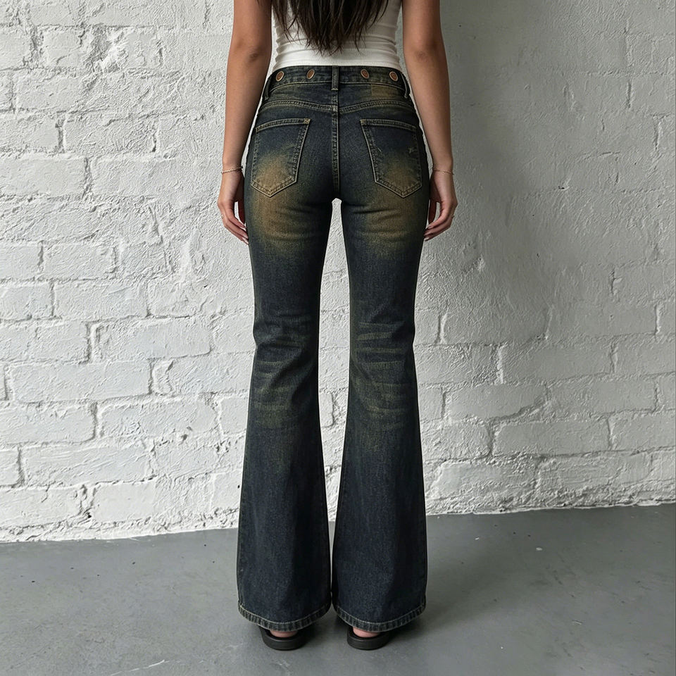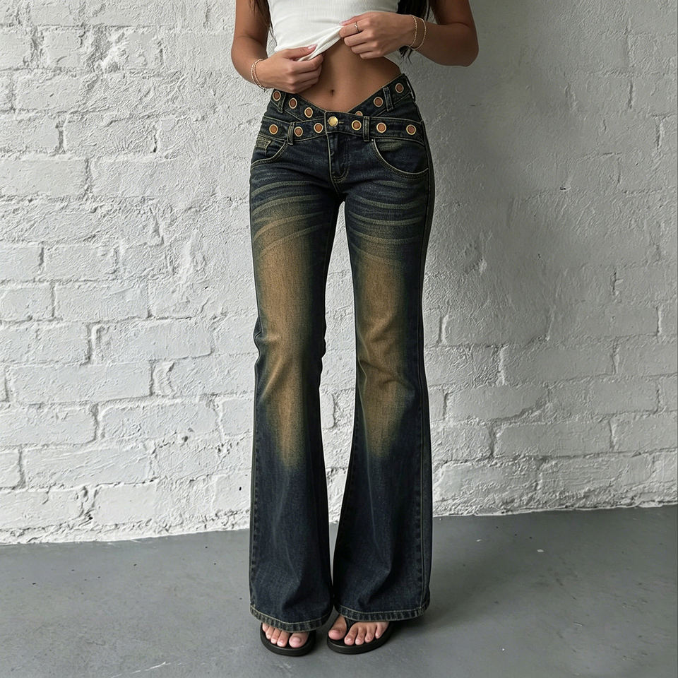 Vaqueros de mujer de tiro bajo con pierna acampanada, lavado oscuro, estilo vintage desgastado, con ojales metálicos, pantalones de mezclilla, estilo Y2K, streetwear, casuales