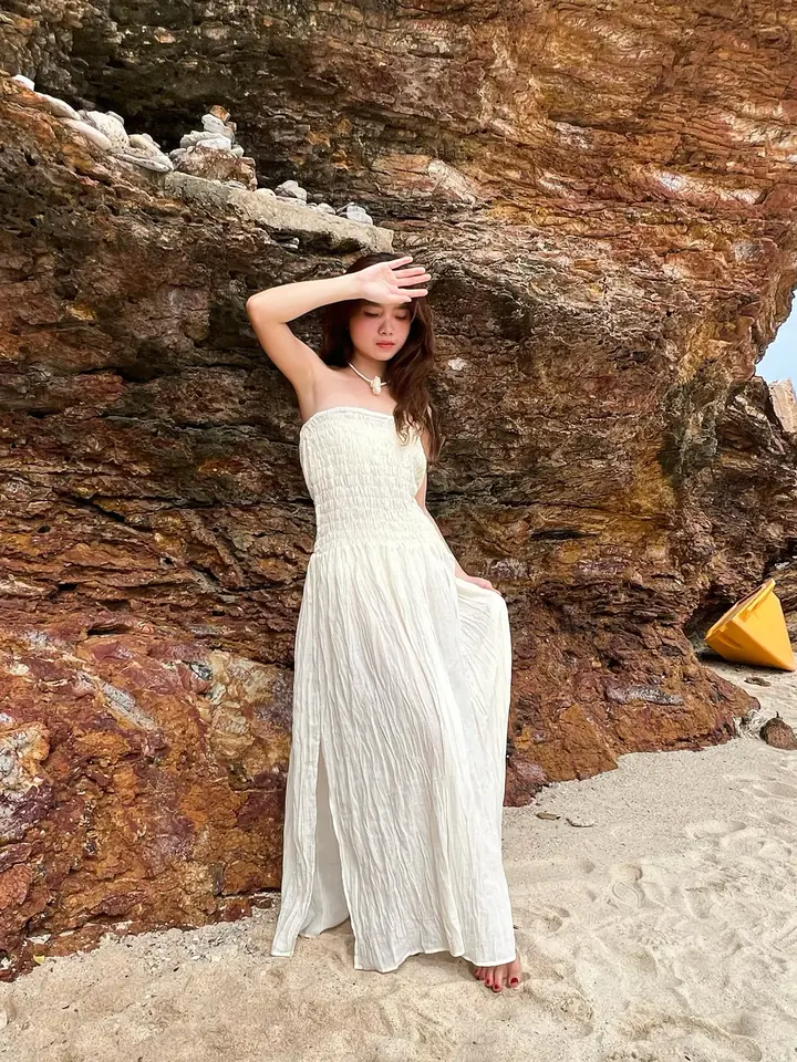 Vestido largo blanco con hombros descubiertos para mujer, vestido largo hasta el suelo de tela de gasa de algodón sin tirantes para fumar en la playa
