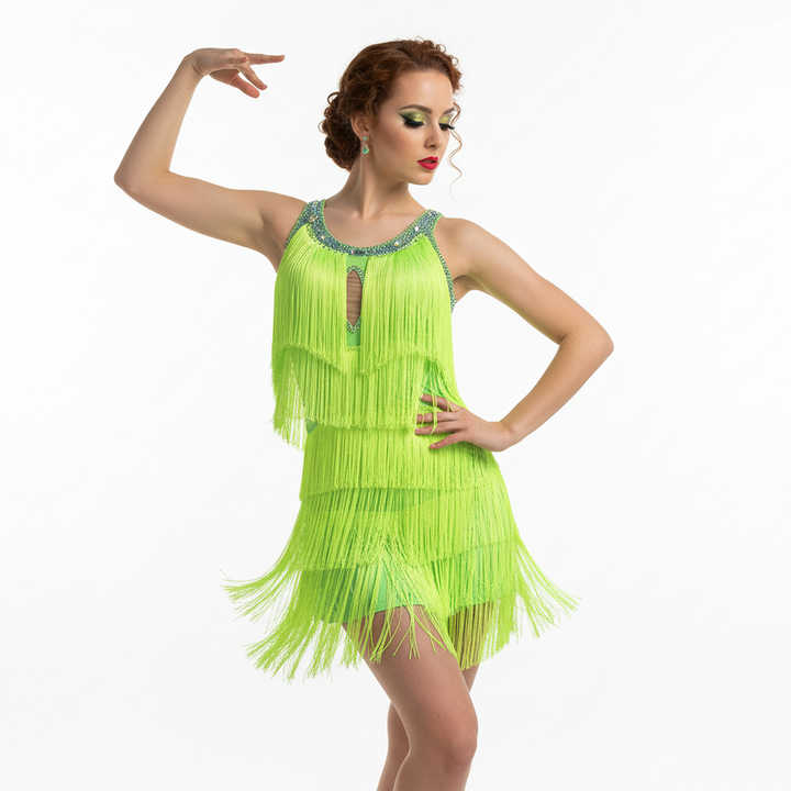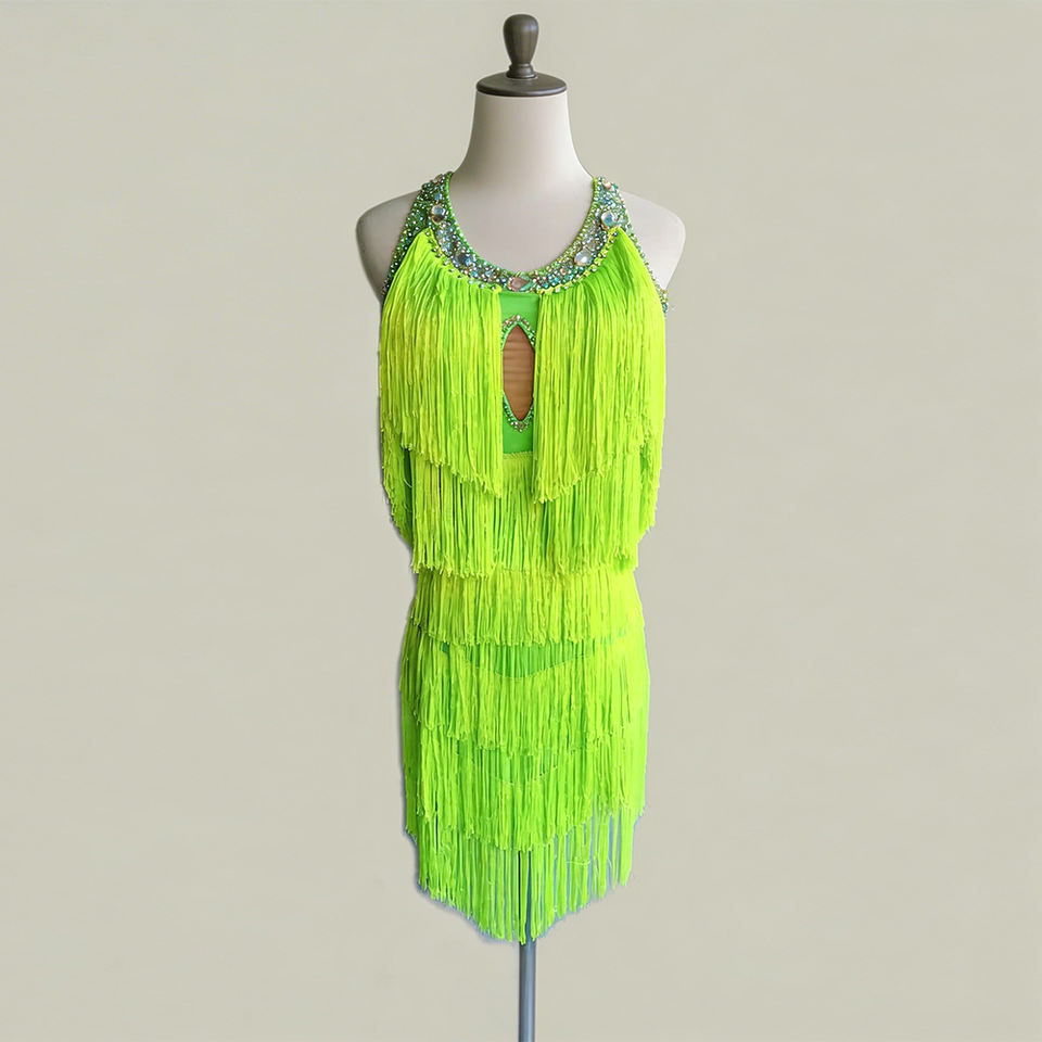 Vestido de baile latino de salón para mujer, verde neón, con flecos y abertura tipo llave, para actuaciones de salsa y cha-cha.