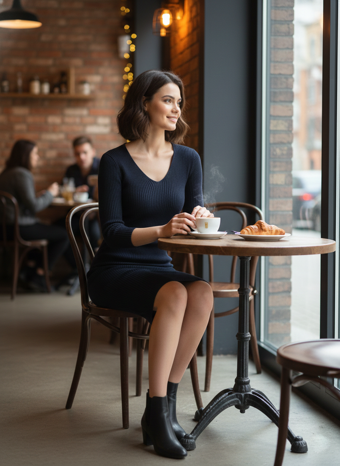 Vestido de Punto Ajustado para Mujer, Textura Acanalada, Cuello en V, Manga Larga, Largo hasta la Rodilla, Estilo Casual para Uso Diario, Color Sólido, Atuendo Chic