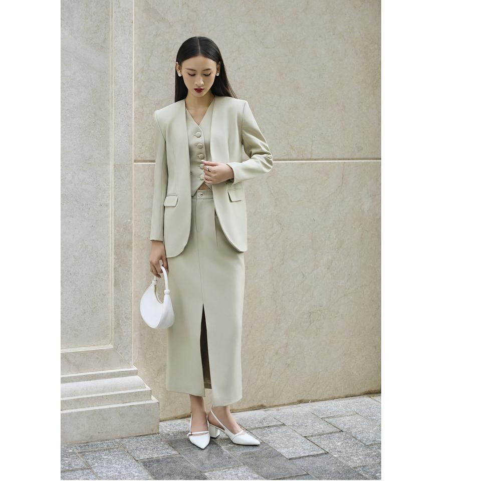 Decoración:Botones forrados en tela (tono sobre tono), línea de bolsillo minimalista, solapa entallada.