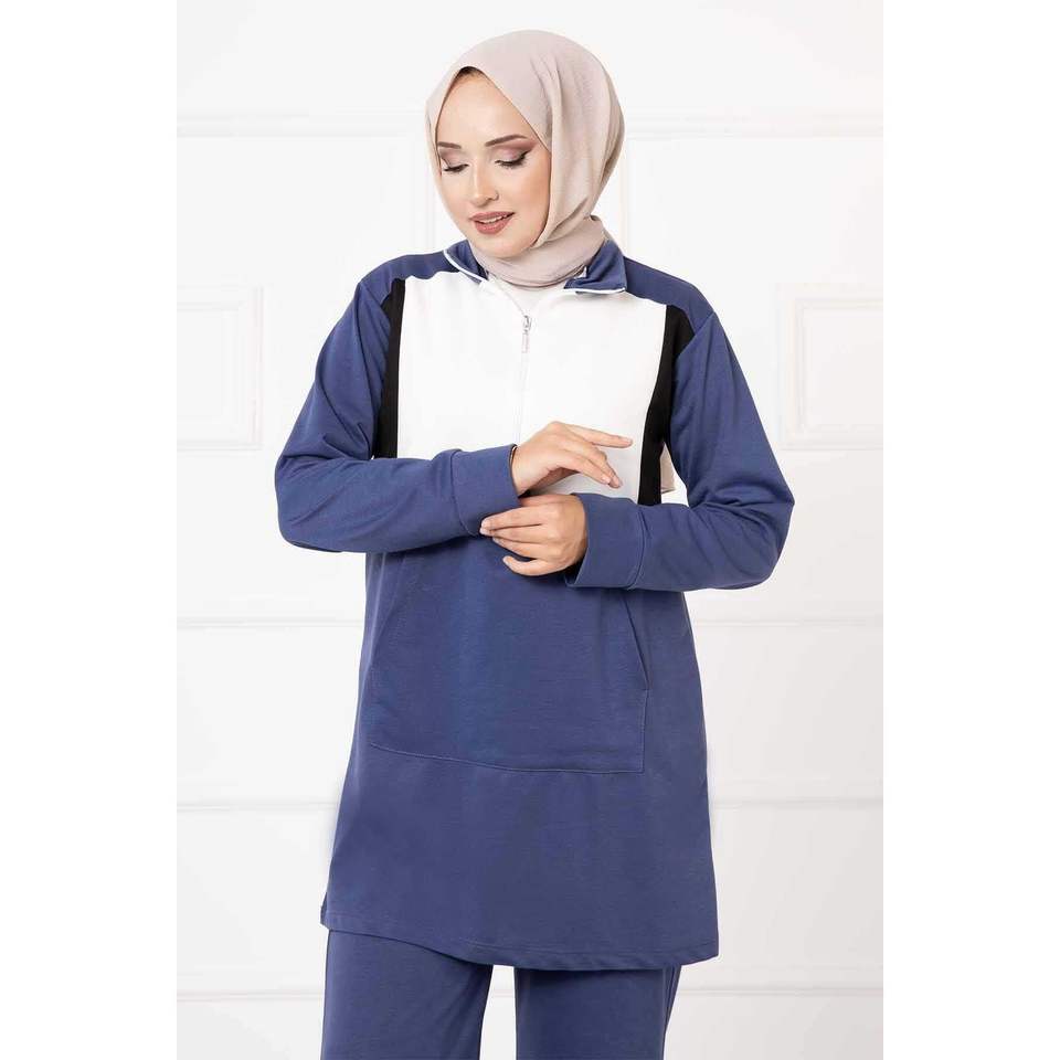 Conjunto informal de 2 piezas para mujer, bolsillo índigo, parte superior acampanada detallada, cuello con capucha, tejido, Otoño, tamaño XS, patrón sólido, decoración de logotipo