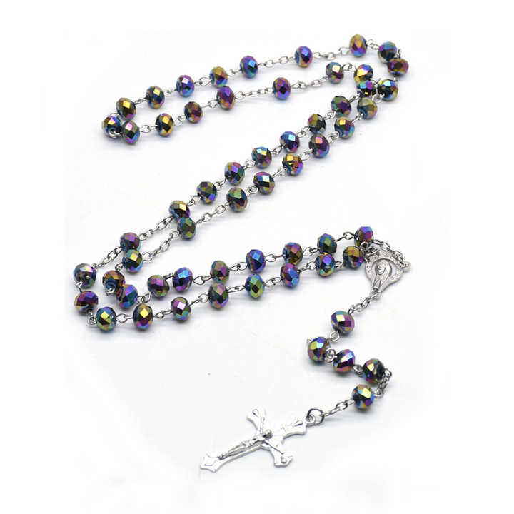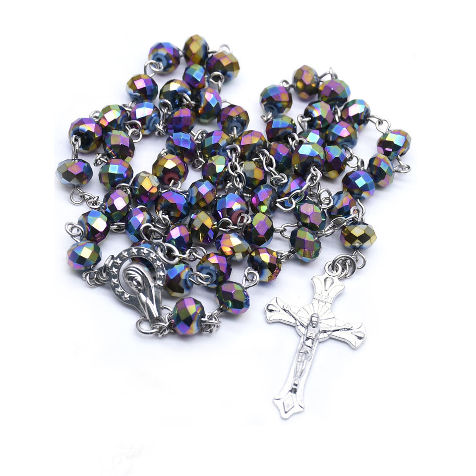 Collar de Rosario con Cruz de Crucifijo Cristiano Católico, Cuentas de Cristal y Cristales de Estrás, para Boda, Unisex