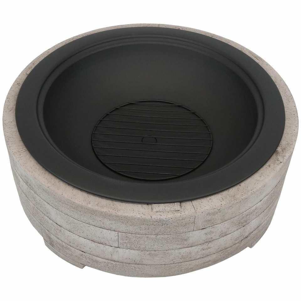 Brasero Moderno de Piedra Sintética de 35 Pulgadas de Diámetro con Asas, Chimenea de Gas Natural para Exteriores con Pantalla Protectora de Chispas, Color Gris Claro