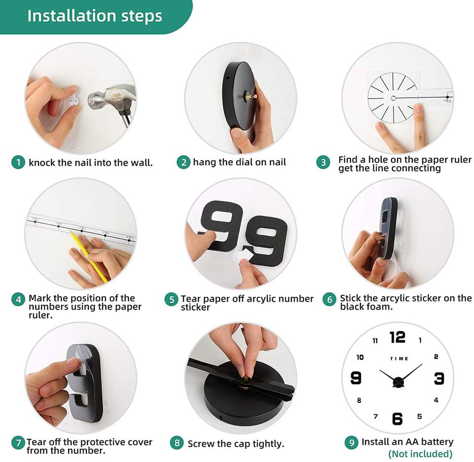 Pegatinas de reloj de pared grandes sin marco 3D, decoración de pared artesanal para sala de estar, dormitorio y oficina, color negro
