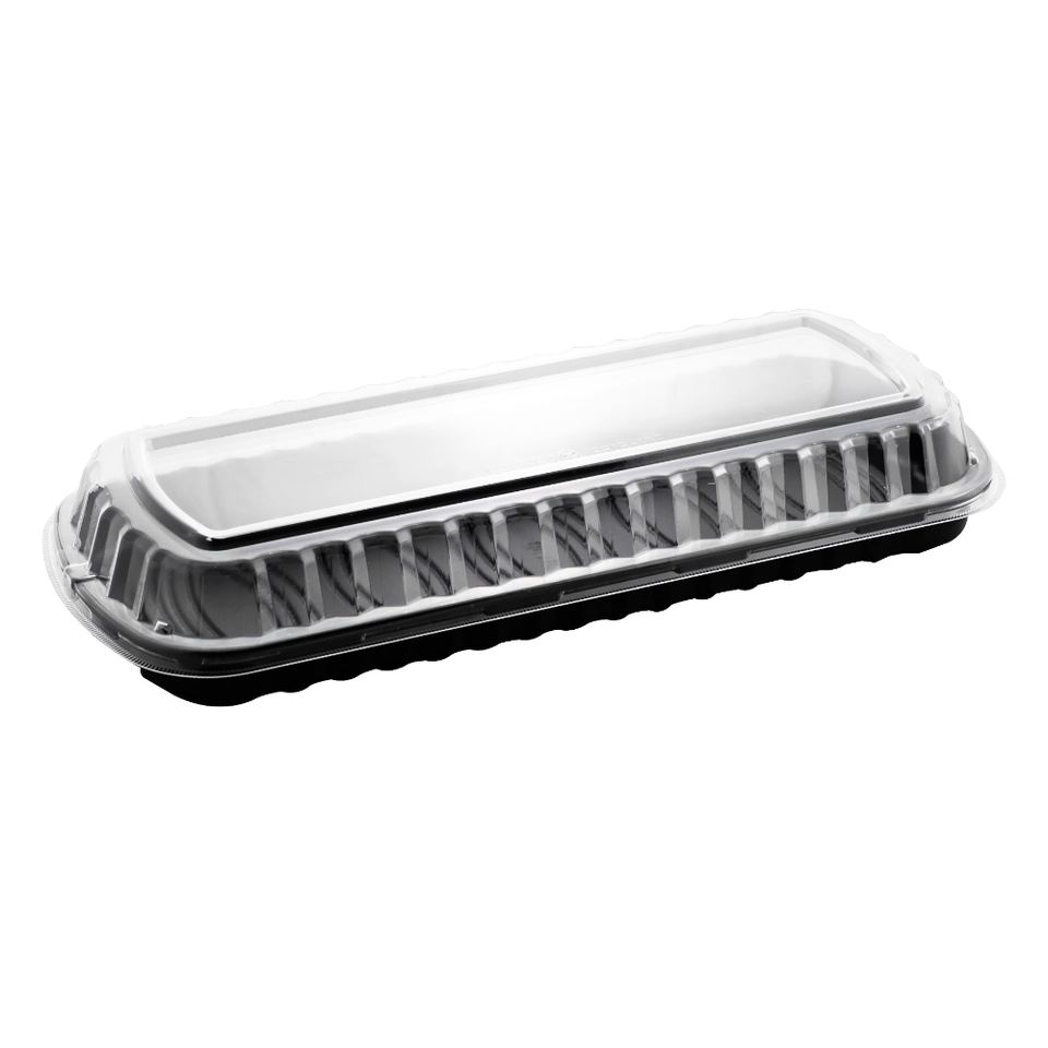 Bandeja rectangular grande de 48 oz con tapa transparente y base negra apta para microondas, hecha en Taiwán para ensaladas y embalaje envolvente