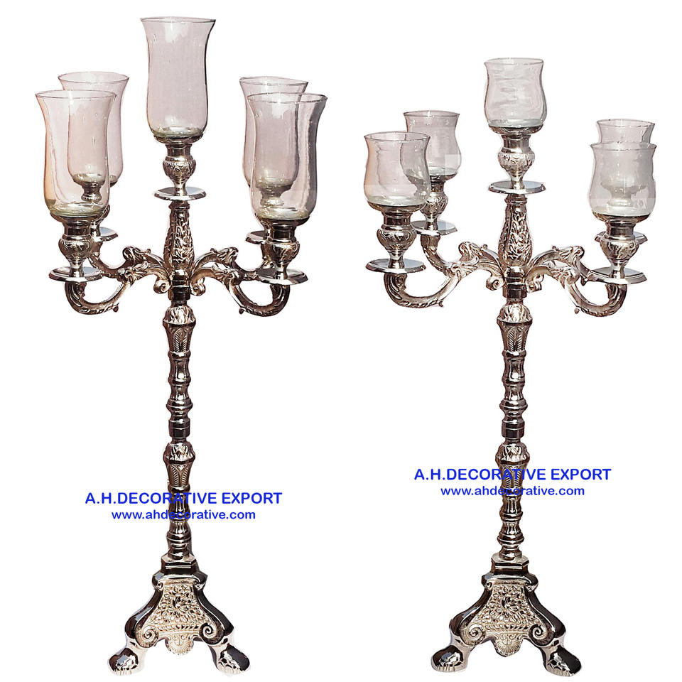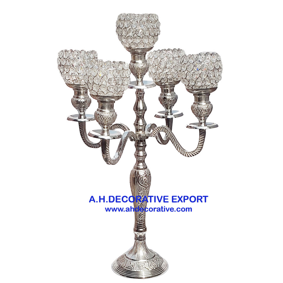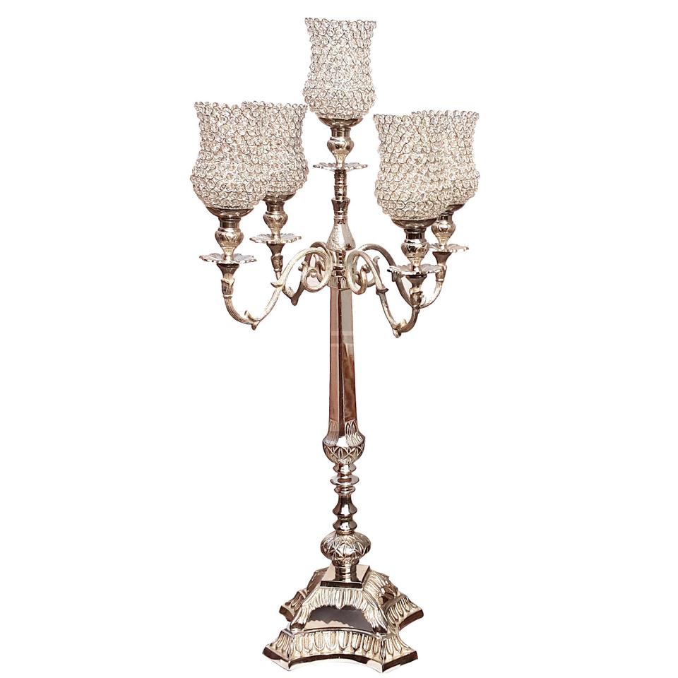 Candelabro de Lujo Grande de 5 Brazos con Base Cuadrada, Plateado Brillante, de Aluminio y Cristal, Portavelas para Decoración de Bodas