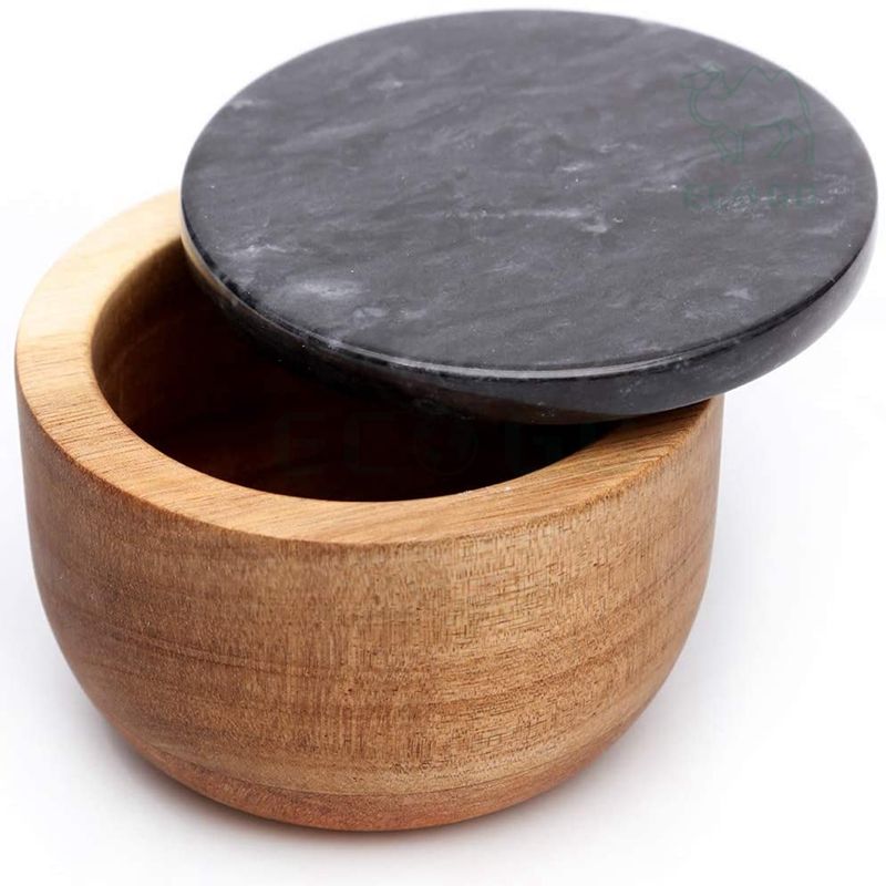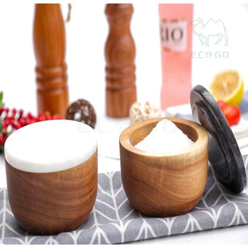 Condimentos de madera de acacia grandes Condimentos Pellizco Tazón de sal Especias con tapa de mármol negro
