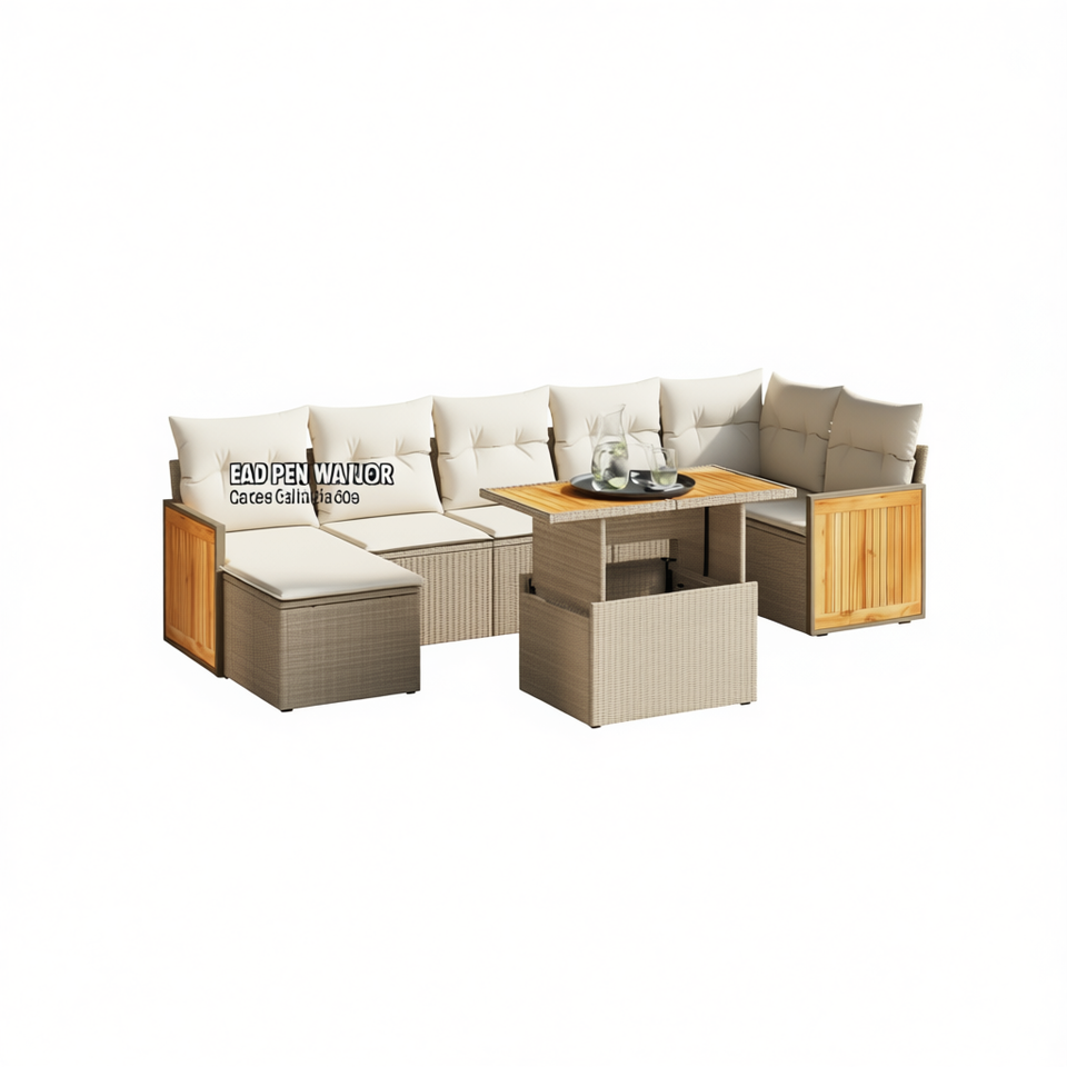 Conjunto de Sofá de Jardín de Ratán Beige con Reposabrazos Ajustables, Muebles de Exterior de 6 Plazas, Diseño Contemporáneo, Estructura de Madera de Teca
