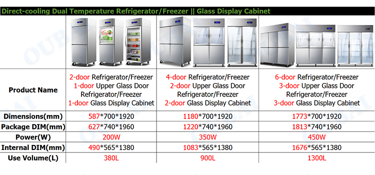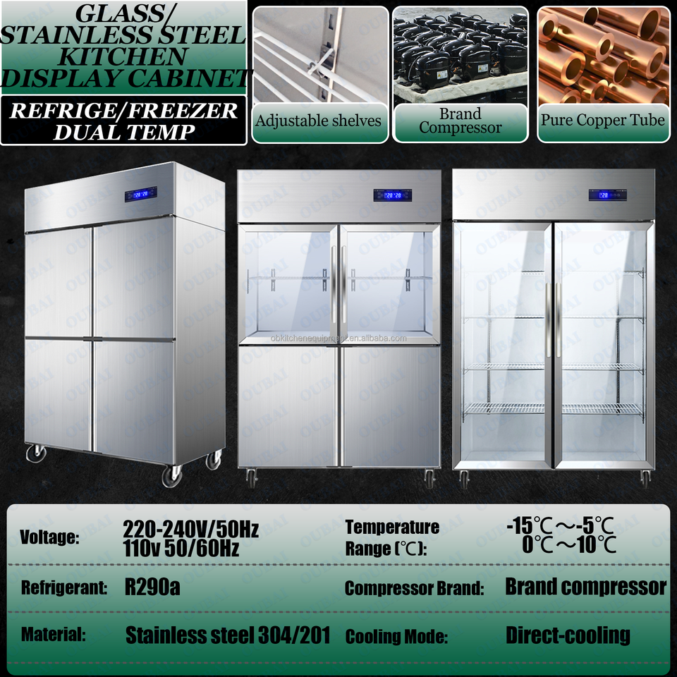 Refrigerador de cocina de acero inoxidable de gran capacidad, 2 puertas, temperatura única, control digital, con puerta de vidrio y estantes.