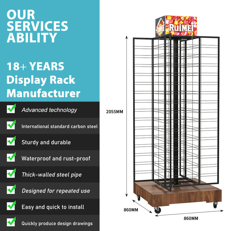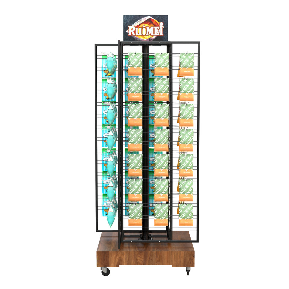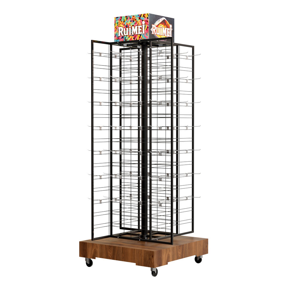 Soporte de exhibición de panel de rejilla de metal de 4 lados de gran capacidad con base de madera y rueda móvil
