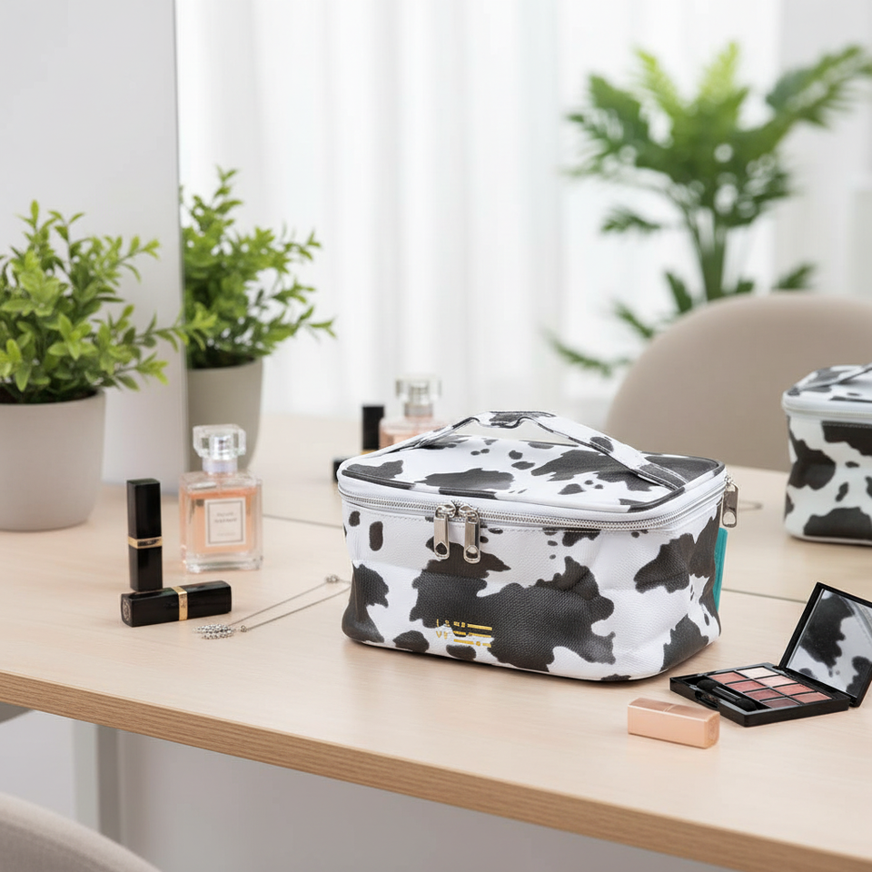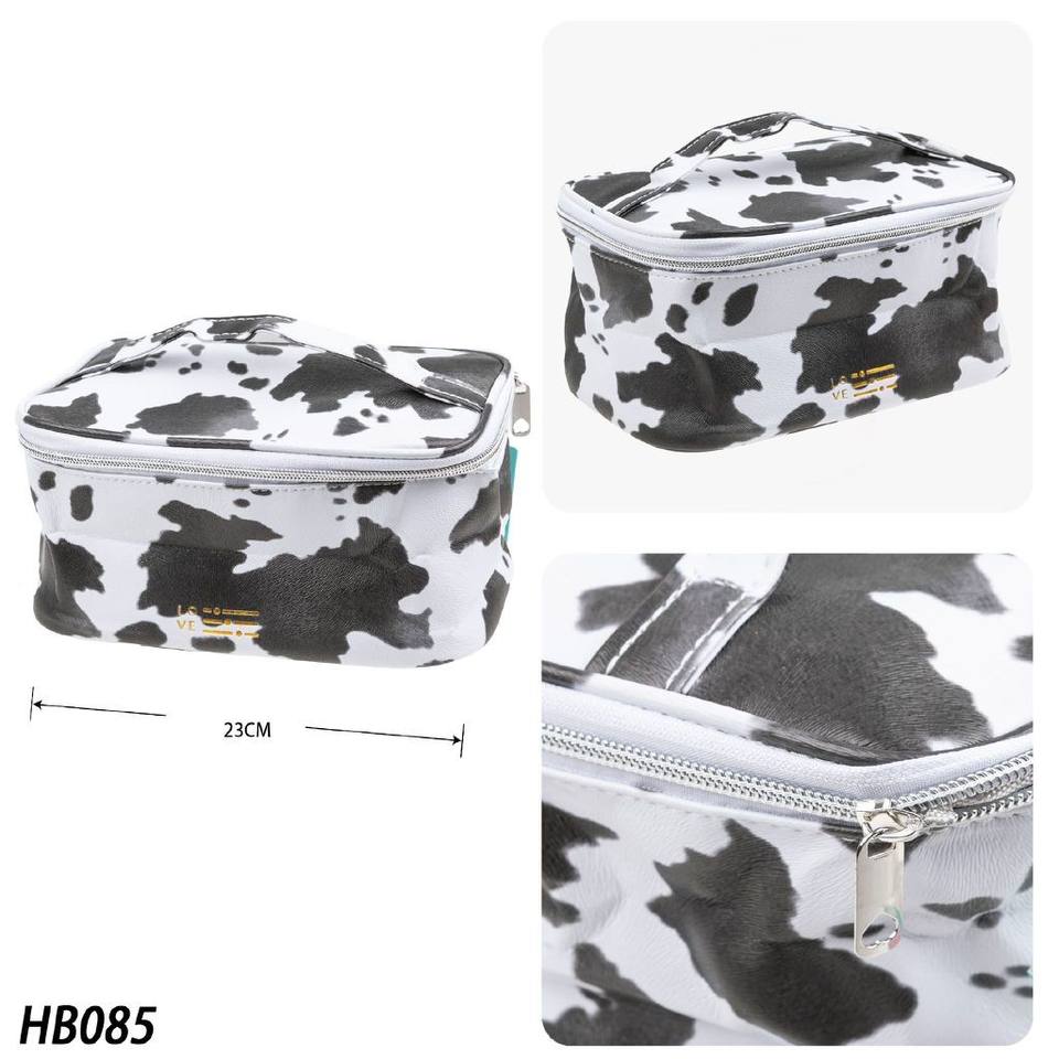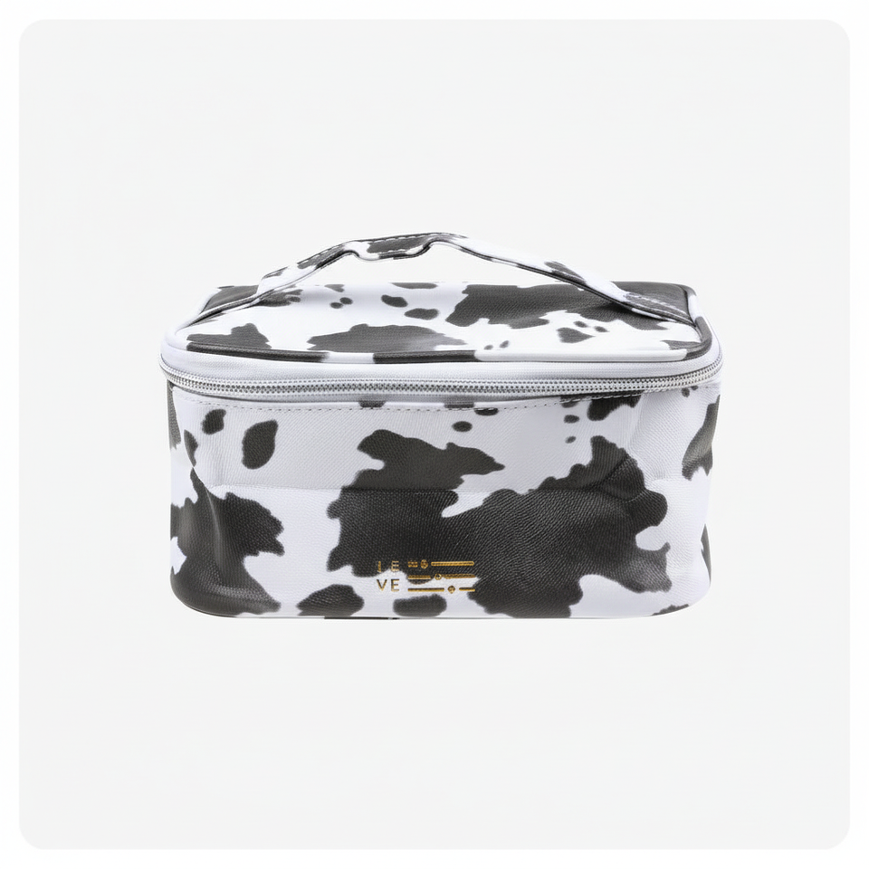Bolsa organizadora de cosméticos con patrón de vaca ecológica de gran capacidad, logotipo personalizado hecho de poliéster