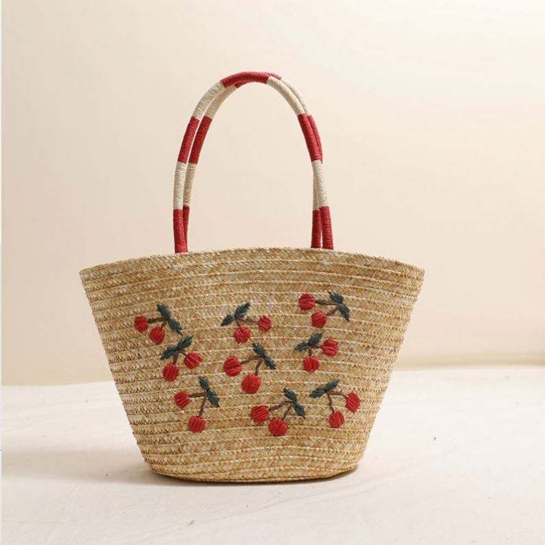 Bolso de Hombro de Paja Tejida con Bordado de Cerezas, Gran Capacidad, Nuevo Estilo, para Vacaciones en la Playa
